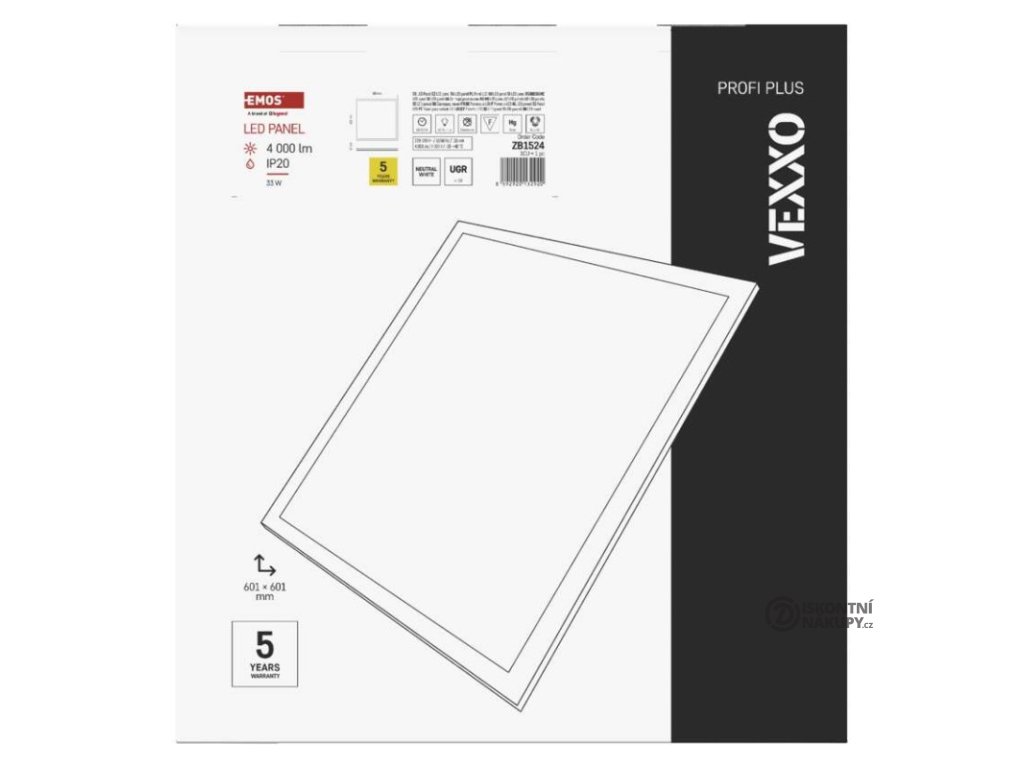 barva světla: neutrální bílá|barva těla: bílá|dálkový ovladač: ne|další funkce: –|do chodby a na schodiště: ano|do dílny a garáže: ne|do kanceláře: ano|do koupelny: ne|do kuchyně: ano|do obýváku, ložnice a dětského pokoje: ano|dosah senzoru: nemá senzor|flicker-free: ano|frekvence: 50/60 Hz|index podání barev (CRI): Ra > 80|jazyky aplikace: –|kategorie: PROFI PLUS|kompatibilita: –|krytí: IP20|materiál difuzoru: plast (PC)|materiál LGP: PMMA|materiál těla: hliník|montážní otvor: neuvádí se|možnost stmívání: ne|náhrada za žárovku: 4× 18 W CFL|napětí: 220–240 V~|na zahradu a balkon: ne|notifikace do mobilní aplikace: ne|obsah balení: –|ovládání hlasovými asistenty: ne|podporované OS: –|pohybový senzor: ne|přenosová frekvence: –|příkon: 33 W|prodejní obal: 1 ks, krabice|protokol: –|proud: 155 mA|řada: VEXXO|rozměr: 601 × 601 × 37 mm|světelná účinnost: 121 lm/W|světelný tok: 4 000 lm|teplota chromatičnosti: 4 000 K|tvar: čtverec|typ difuzoru: mikroprizmatický|typ svítidla: panel|účiník: > 0,9|UGR<: 19|úhel vyzařování: 90°|umístění: stropní/nástěnné|výstupní proud ze zdroje: 900 mA|záruční doba: 5 let|zdroj světla: LED|životnost: 50 000 hodin|způsob montáže: přisazenéDoplňkové parametry