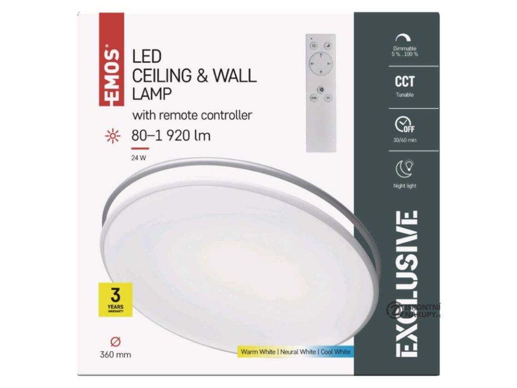 barva světla: teplá bílá–studená bílá|barva těla: bílá|dálkový ovladač: ano (2× AAA, R03)|do chodby a na schodiště: ne|do dílny a garáže: ne|do kanceláře: ano|do koupelny: ne|do kuchyně: ano|do obýváku, ložnice a dětského pokoje: ano|dosah senzoru: nemá senzor|flicker-free: ano|frekvence: 50/60 Hz|index podání barev (CRI): Ra > 80|kategorie: EXCLUSIVE|krytí: IP20|materiál difuzoru: plast (PMMA)|materiál LGP: neuvádí se|materiál těla: ocelový plech|montážní otvor: neuvádí se|možnost stmívání: ano|náhrada za žárovku: 120 W|napětí: 220–240 V|na zahradu a balkon: ne|pohybový senzor: ne|příkon: 24 W|prodejní obal: 1 ks, krabice|proud: 125 mA|řada: ALVI|rozměr: průměr 360 × 58 mm|světelná účinnost: 80 lm/W|světelný tok: 80–1 920 lm|teplota chromatičnosti: 2 700–6 500 K|tvar: kruh|typ difuzoru: mléčný|typ svítidla: klasické svítidlo|účiník: > 0,5|UGR<: neuvádí se|úhel vyzařování: 115°|umístění: stropní|výstupní proud ze zdroje: neuvádí se|záruční doba: 3 roky|zdroj světla: LED|životnost: 25 000 hodin|způsob montáže: přisazenéVýhody produktu