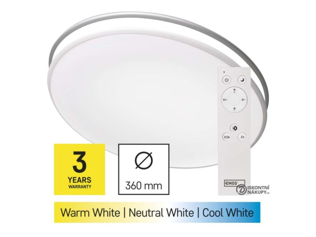Možnost nastavení barvy světla od teplé bílé po studenou bílou.Ovládání barvy světla možné také pomocí vypínače, opětovným vypnutím a zapnutím svítidla.Dálkovým ovladačem je ovládáno naráz i více těchto svítidel.Timer – možnost vypnutí po 30 a 60 minutách.Efekt osvitu stropu okolo svítidla – ambient efekt.Noční světlo.Rámečky ve 2 barvách součástí balení (bílá, stříbrná).Difuzor z PMMA pro rovnoměrné šíření světla, nežloutne.LED technologie šetří finance – úsporné – až 80% úspora oproti bežným žárovkám.Snadná montáž a údržba, unikátní design.