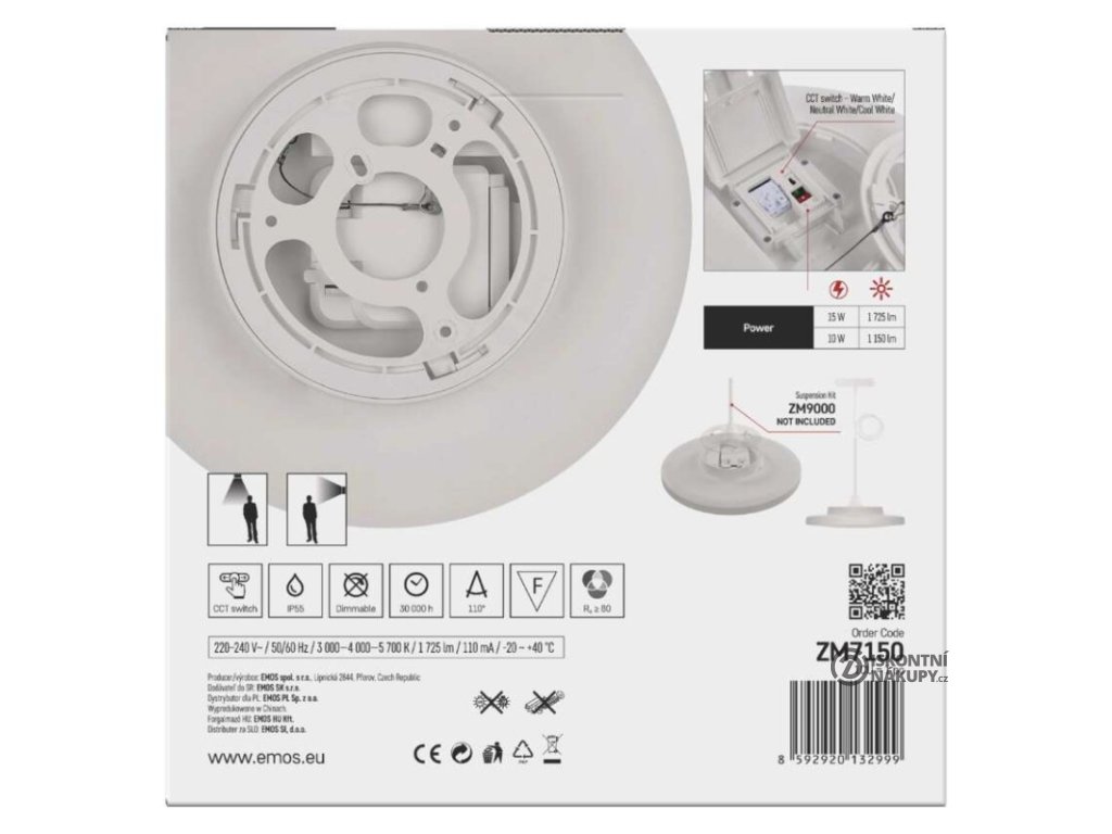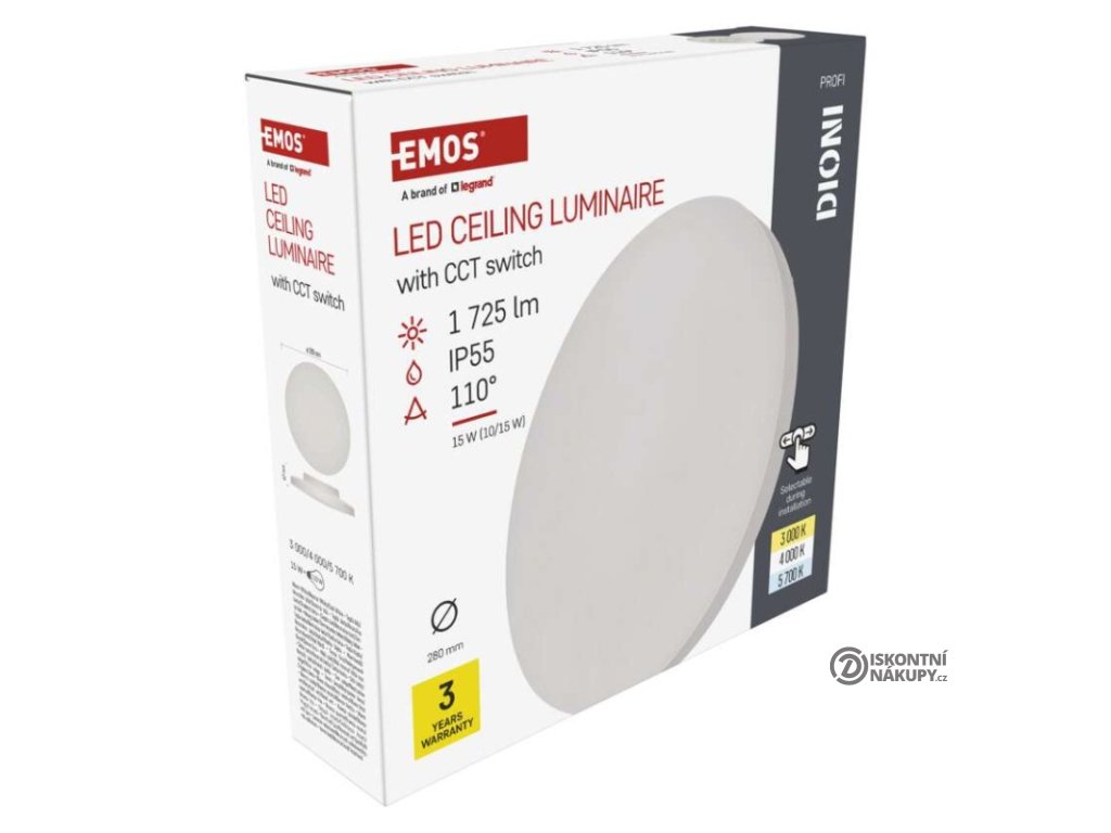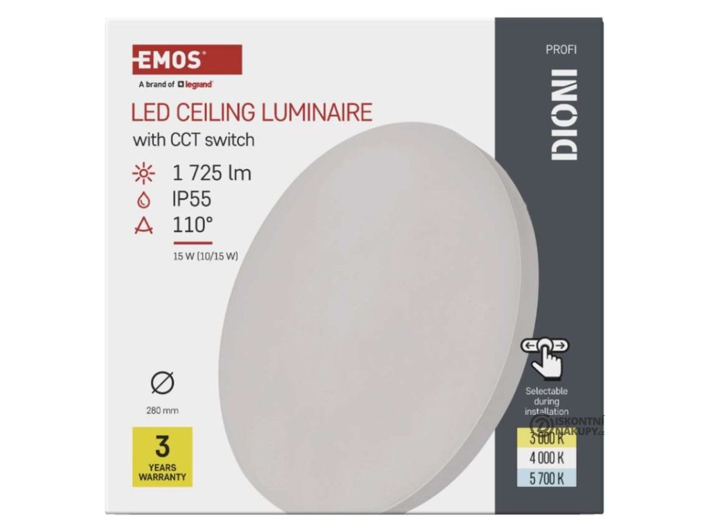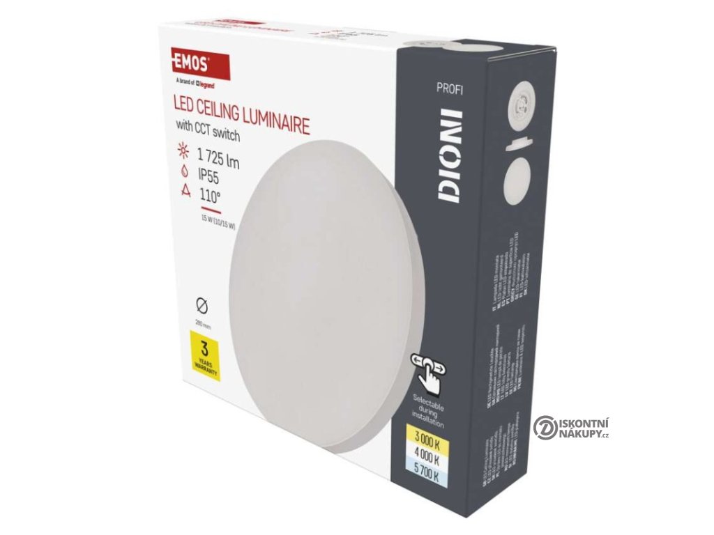 barva světla: teplá/neutrální/studená bílá|barva těla: bílá|dálkový ovladač: ne|další funkce: –|do chodby a na schodiště: ano|do dílny a garáže: ne|do kanceláře: ano|do koupelny: ano|do kuchyně: ano|do obýváku, ložnice a dětského pokoje: ano|dosah senzoru: neuvádí se|flicker-free: nebliká|frekvence: 50/60 Hz|index podání barev (CRI): Ra > 80|jazyky aplikace: –|kategorie: PROFI|kompatibilita: –|krytí: IP55|materiál difuzoru: plast|materiál LGP: neuvádí se|materiál těla: plast|montážní otvor: ne|možnost stmívání: ne|náhrada za žárovku: 110 W|napětí: 220–240 V~|na zahradu a balkon: ano|notifikace do mobilní aplikace: ne|obsah balení: –|ovládání hlasovými asistenty: ne|podporované OS: –|pohybový senzor: ne|přenosová frekvence: –|příkon: 15 W|prodejní obal: 1 ks, krabice|protokol: –|proud: 62 mA|řada: DIONI|rozměr: průměr 280 × 62 mm|světelná účinnost: 115 lm/W|světelný tok: 1 725 lm|teplota chromatičnosti: 3 000/4 000/5 700 K|tvar: kruh|typ difuzoru: mléčný|typ svítidla: klasické svítidlo|účiník: > 0,8|UGR<: neuvádí se|úhel vyzařování: 110°|umístění: stropní/nástěnné|výstupní proud ze zdroje: neuvádí se|záruční doba: 3 roky|zdroj světla: LED|životnost: 30 000 hodin|způsob montáže: přisazené/závěsnéDoplňkové parametry