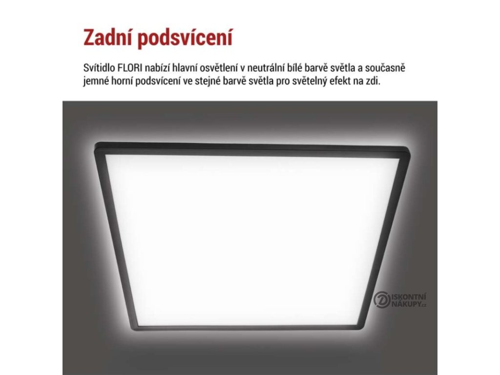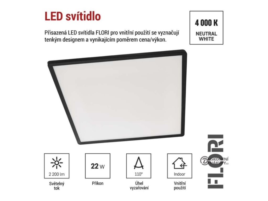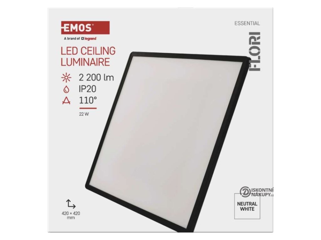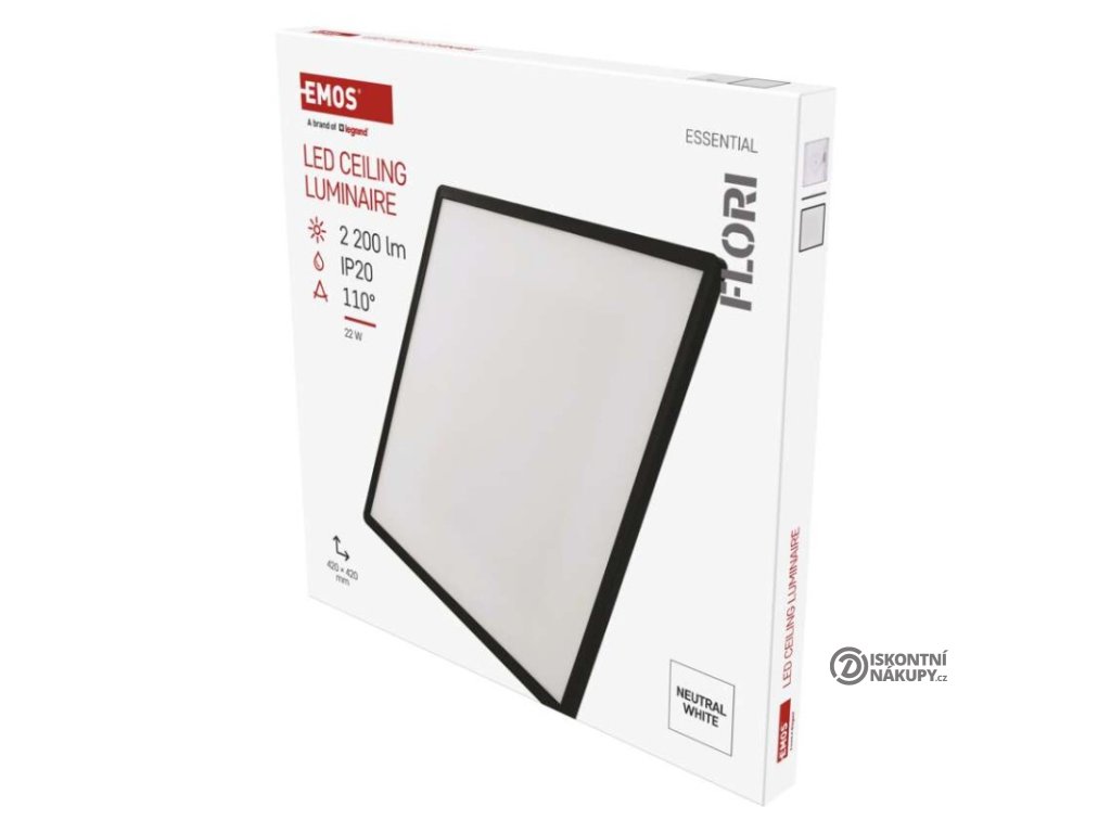 barva světla: neutrální bílá|barva těla: černá|dálkový ovladač: ne|do chodby a na schodiště: ano|do dílny a garáže: ne|do kanceláře: ne|do koupelny: ne|do kuchyně: ano|do obýváku, ložnice a dětského pokoje: ano|dosah senzoru: neuvádí se|flicker-free: neuvádí se|frekvence: 50/60 Hz|index podání barev (CRI): Ra > 80|kategorie: ESSENTIAL|krytí: IP20|materiál difuzoru: plast|materiál LGP: neuvádí se|materiál těla: plast|montážní otvor: neuvádí se|možnost stmívání: ne|náhrada za žárovku: 130 W|napětí: 220–240 V~|na zahradu a balkon: ne|pohybový senzor: ne|příkon: 22 W|prodejní obal: 1 ks, krabice|proud: 165 mA|řada: FLORI|rozměr: 420 × 420 × 29 mm|světelná účinnost: 100 lm/W|světelný tok: 2 200 lm|teplota chromatičnosti: 4 000 K|tvar: čtverec|typ difuzoru: mléčný|typ svítidla: klasické svítidlo|účiník: > 0,5|UGR<: neuvádí se|úhel vyzařování: 110°|umístění: stropní/nástěnné|výstupní proud ze zdroje: neuvádí se|záruční doba: 2 roky|zdroj světla: LED|životnost: 15 000 hodin|způsob montáže: přisazenéDoplňkové parametry