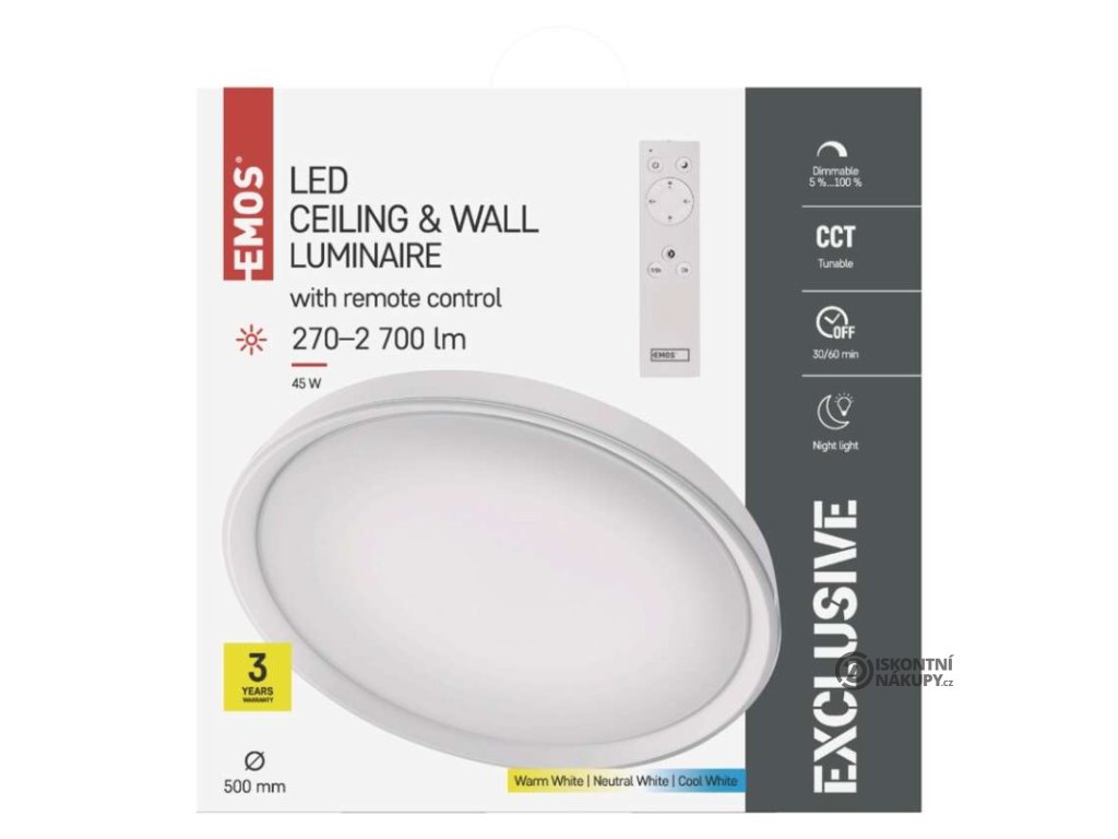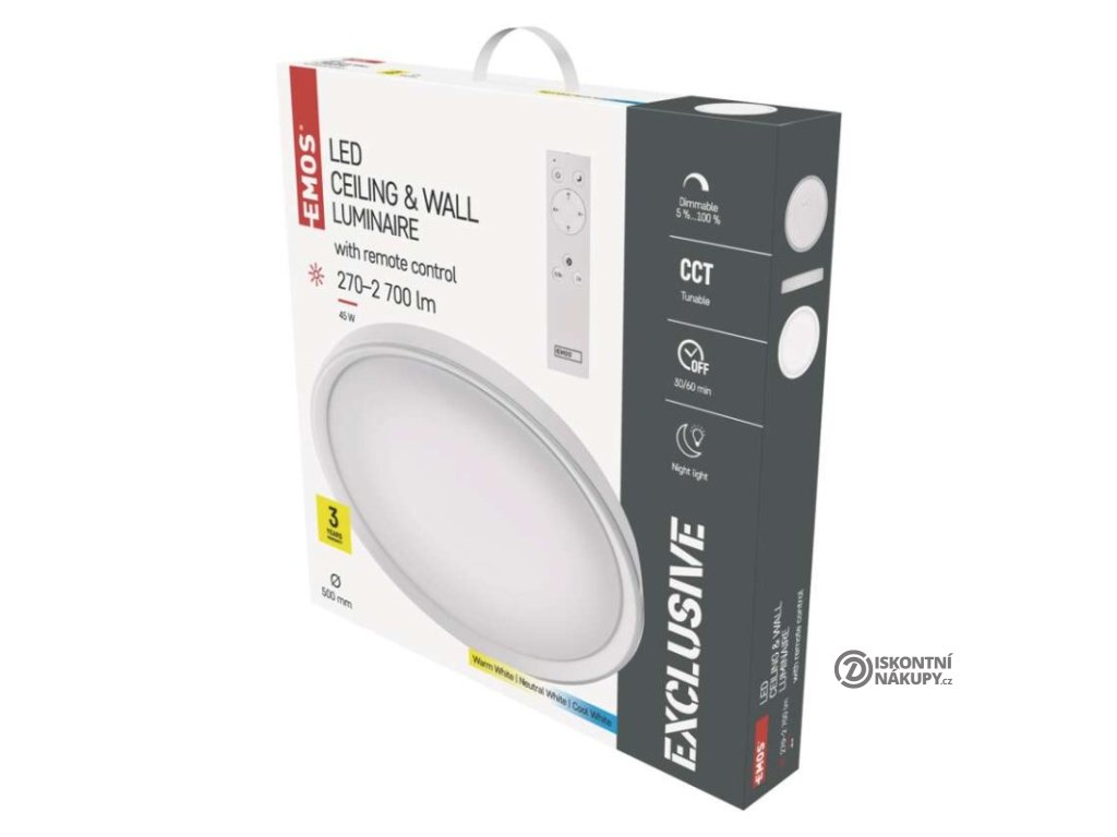 barva světla: teplá bílá–studená bílá|barva těla: bílá|dálkový ovladač: ano|do chodby a na schodiště: ne|do dílny a garáže: ne|do kanceláře: ano|do koupelny: ne|do kuchyně: ano|do obýváku, ložnice a dětského pokoje: ano|dosah senzoru: nemá senzor|flicker-free: ano|frekvence: 50/60 Hz|index podání barev (CRI): Ra > 80|kategorie: EXCLUSIVE|krytí: IP20|materiál difuzoru: plast (PMMA)|materiál LGP: neuvádí se|materiál těla: plast (PS) + ocelový plech|montážní otvor: neuvádí se|možnost stmívání: ano|náhrada za žárovku: 160 W|napětí: 220–240 V|na zahradu a balkon: ne|pohybový senzor: neuvádí se|příkon: 45 W|prodejní obal: 1 ks, krabice|proud: 340 mA|řada: ILVI|rozměr: průměr 500 × 70 mm|světelná účinnost: 60 lm/W|světelný tok: 270–2 700 lm|teplota chromatičnosti: 2 700–6 500 K|tvar: kruh|typ difuzoru: mléčný|typ svítidla: klasické svítidlo|účiník: > 0,9|UGR<: neuvádí se|úhel vyzařování: 120°|umístění: stropní|výstupní proud ze zdroje: 250 mA|záruční doba: 3 roky|zdroj světla: LED|životnost: 30 000 hodin|způsob montáže: přisazenéVýhody produktu
