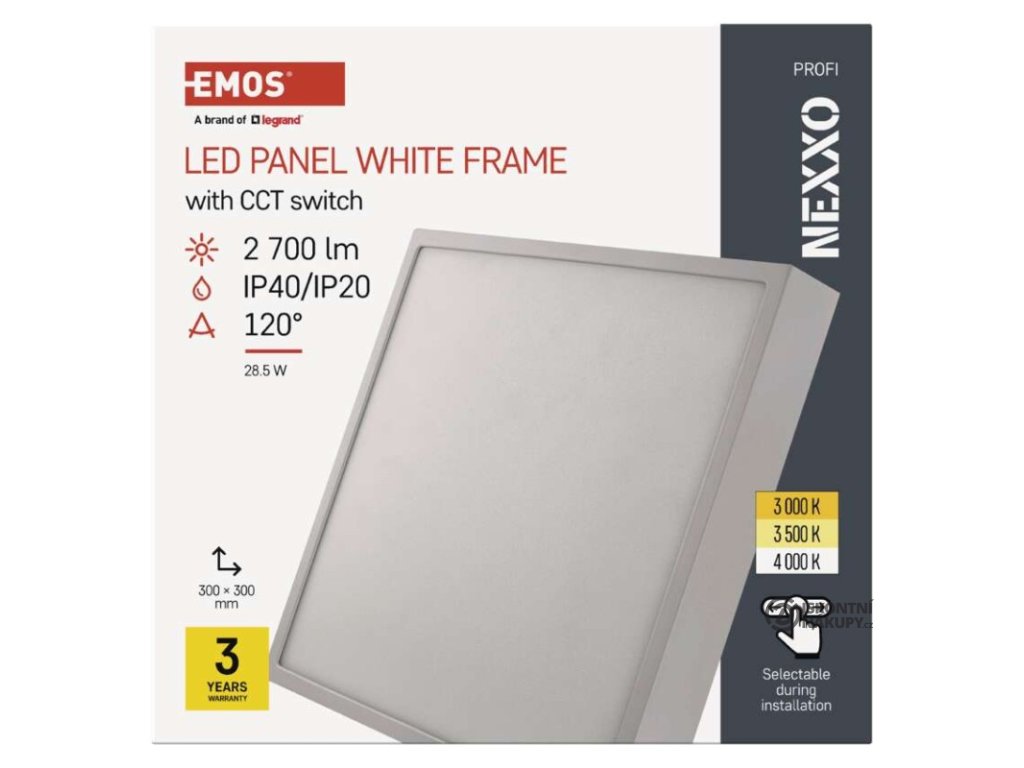 barva světla: teplá bílá–neutrální bílá|barva těla: bílá|dálkový ovladač: ne|do chodby a na schodiště: ano|do dílny a garáže: ne|do kanceláře: ano|do koupelny: ne|do kuchyně: ano|do obýváku, ložnice a dětského pokoje: ano|dosah senzoru: nemá senzor|flicker-free: ano|frekvence: 50/60 Hz|index podání barev (CRI): Ra > 80|kategorie: PROFI|krytí: IP40/IP20|materiál difuzoru: plast (PMMA)|materiál LGP: PMMA|materiál těla: ocelový plech|montážní otvor: neuvádí se|možnost stmívání: ne|náhrada za žárovku: 160 W|napětí: 220–240 V|na zahradu a balkon: ne|pohybový senzor: ne|příkon: 28,5 W|prodejní obal: 1 ks, krabice|proud: 700 mA|řada: NEXXO|rozměr: 300 × 300 × 42 mm|světelná účinnost: 95 lm/W|světelný tok: 2 700 lm|teplota chromatičnosti: 3 000/3 500/4 000 K|tvar: čtverec|typ difuzoru: mléčný|typ svítidla: klasické svítidlo|účiník: > 0,9|UGR<: neuvádí se|úhel vyzařování: 120°|umístění: stropní/nástěnné|výstupní proud ze zdroje: neuvádí se|záruční doba: 3 roky|zdroj světla: LED|životnost: 30 000 hodin|způsob montáže: přisazenéVýhody produktu