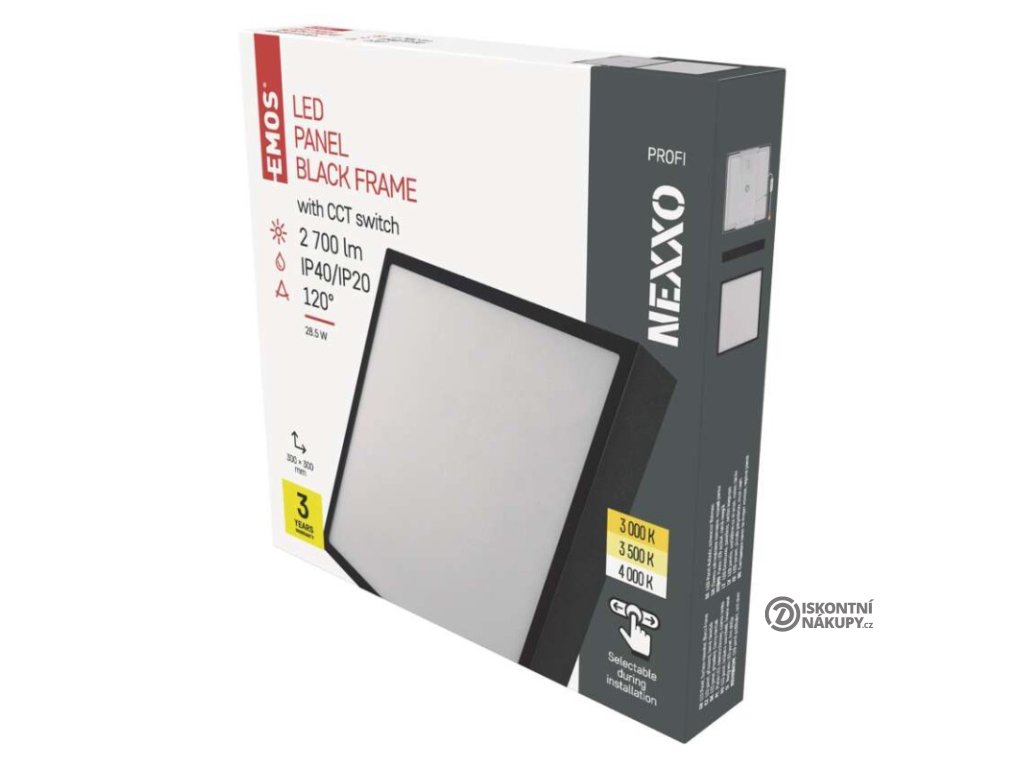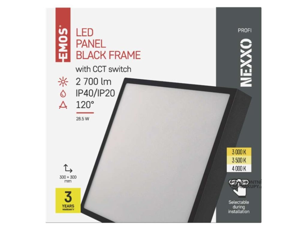 barva světla: teplá bílá–neutrální bílá|barva těla: černá|dálkový ovladač: ne|do chodby a na schodiště: ano|do dílny a garáže: ne|do kanceláře: ano|do koupelny: ne|do kuchyně: ano|do obýváku, ložnice a dětského pokoje: ano|dosah senzoru: nemá senzor|flicker-free: ano|frekvence: 50/60 Hz|index podání barev (CRI): Ra > 80|kategorie: PROFI|krytí: IP40/IP20|materiál difuzoru: plast (PMMA)|materiál LGP: PMMA|materiál těla: ocelový plech|montážní otvor: neuvádí se|možnost stmívání: ne|náhrada za žárovku: 160 W|napětí: 220–240 V|na zahradu a balkon: ne|pohybový senzor: ne|příkon: 28,5 W|prodejní obal: 1 ks, krabice|proud: 700 mA|řada: NEXXO|rozměr: 300 × 300 × 42 mm|světelná účinnost: 95 lm/W|světelný tok: 2 700 lm|teplota chromatičnosti: 3 000/3 500/4 000 K|tvar: čtverec|typ difuzoru: mléčný|typ svítidla: klasické svítidlo|účiník: > 0,9|UGR<: neuvádí se|úhel vyzařování: 120°|umístění: stropní/nástěnné|výstupní proud ze zdroje: neuvádí se|záruční doba: 3 roky|zdroj světla: LED|životnost: 30 000 hodin|způsob montáže: přisazenéVýhody produktu
