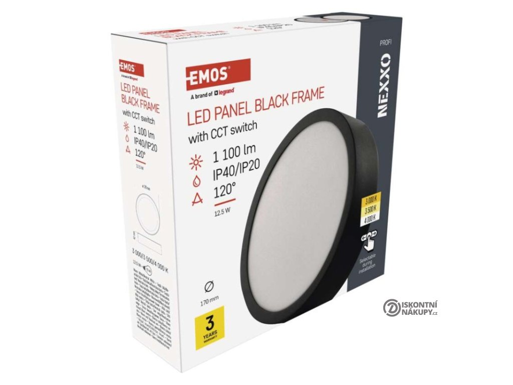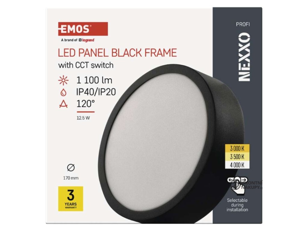 barva světla: teplá bílá–neutrální bílá|barva těla: černá|dálkový ovladač: ne|do chodby a na schodiště: ano|do dílny a garáže: ne|do kanceláře: ano|do koupelny: ne|do kuchyně: ano|do obýváku, ložnice a dětského pokoje: ano|dosah senzoru: nemá senzor|flicker-free: ano|frekvence: 50/60 Hz|index podání barev (CRI): Ra > 80|kategorie: PROFI|krytí: IP40/IP20|materiál difuzoru: plast (PMMA)|materiál LGP: PMMA|materiál těla: ocelový plech|montážní otvor: neuvádí se|možnost stmívání: ne|náhrada za žárovku: 75 W|napětí: 220–240 V|na zahradu a balkon: ne|pohybový senzor: ne|příkon: 12,5 W|prodejní obal: 1 ks, krabice|proud: 300 mA|řada: NEXXO|rozměr: průměr 170 × 42 mm|světelná účinnost: 90 lm/W|světelný tok: 1 100 lm|teplota chromatičnosti: 3 000/3 500/4 000 K|tvar: kruh|typ difuzoru: mléčný|typ svítidla: klasické svítidlo|účiník: > 0,5|UGR<: neuvádí se|úhel vyzařování: 120°|umístění: stropní/nástěnné|výstupní proud ze zdroje: neuvádí se|záruční doba: 3 roky|zdroj světla: LED|životnost: 30 000 hodin|způsob montáže: přisazenéVýhody produktu