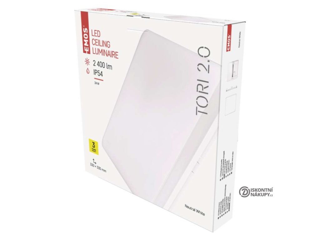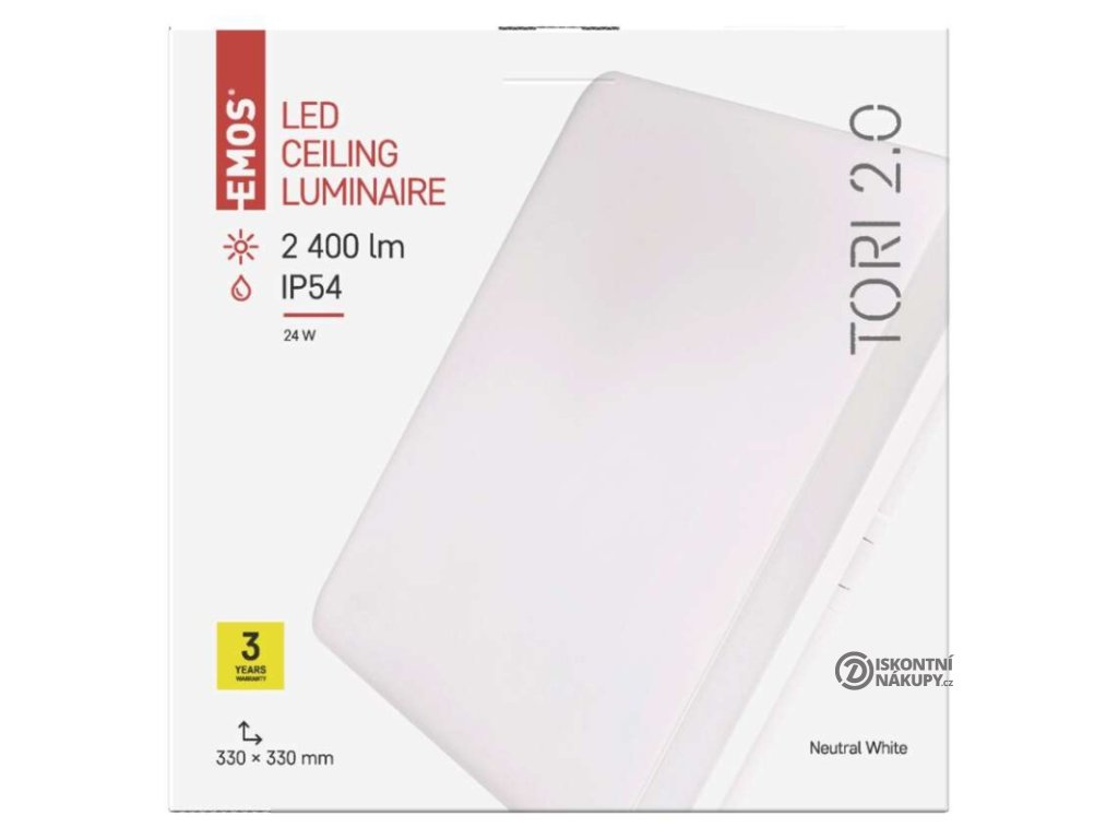 barva světla: neutrální bílá|barva těla: bílá|dálkový ovladač: ne|do chodby a na schodiště: ano|do dílny a garáže: ano|do kanceláře: ne|do koupelny: ano|do kuchyně: ano|do obýváku, ložnice a dětského pokoje: ne|dosah senzoru: neuvádí se|flicker-free: ano|frekvence: 50/60 Hz|index podání barev (CRI): Ra > 80|kategorie: CLASSIC|krytí: IP54|materiál difuzoru: plast (PC)|materiál LGP: neuvádí se|materiál těla: plast (PC)|montážní otvor: neuvádí se|možnost stmívání: ne|náhrada za žárovku: 145 W|napětí: 220–240 V|na zahradu a balkon: ano|pohybový senzor: ne|příkon: 24 W|prodejní obal: 1 ks, krabice|proud: 270 mA|řada: TORI|rozměr: 330 × 330 × 53 mm|světelná účinnost: 100 lm/W|světelný tok: 2 400 lm|teplota chromatičnosti: 4 000 K|tvar: čtverec|typ difuzoru: mléčný|typ svítidla: klasické svítidlo|účiník: > 0,9|UGR<: neuvádí se|úhel vyzařování: 120°|umístění: stropní/nástěnné|výstupní proud ze zdroje: neuvádí se|záruční doba: 3 roky|zdroj světla: LED|životnost: 30 000 hodin|způsob montáže: přisazenéDoplňkové parametry