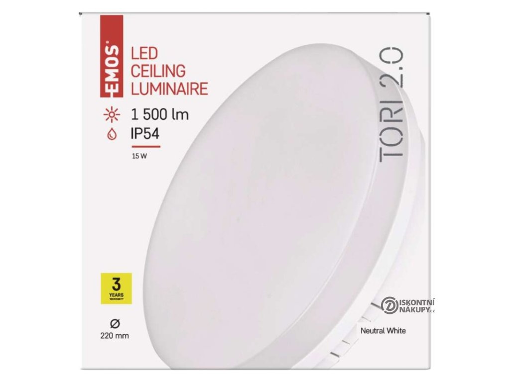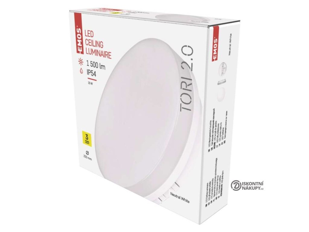 barva světla: neutrální bílá|barva těla: bílá|dálkový ovladač: ne|do chodby a na schodiště: ano|do dílny a garáže: ano|do kanceláře: ne|do koupelny: ano|do kuchyně: ano|do obýváku, ložnice a dětského pokoje: ne|dosah senzoru: neuvádí se|flicker-free: ano|frekvence: 50/60 Hz|index podání barev (CRI): Ra > 80|kategorie: CLASSIC|krytí: IP54|materiál difuzoru: plast (PC)|materiál LGP: neuvádí se|materiál těla: plast (PC)|montážní otvor: neuvádí se|možnost stmívání: ne|náhrada za žárovku: 100 W|napětí: 220–240 V|na zahradu a balkon: ano|pohybový senzor: ne|příkon: 15 W|prodejní obal: 1 ks, krabice|proud: 200 mA|řada: TORI|rozměr: průměr 220 × 53 mm|světelná účinnost: 100 lm/W|světelný tok: 1 500 lm|teplota chromatičnosti: 4 000 K|tvar: kruh|typ difuzoru: mléčný|typ svítidla: klasické svítidlo|účiník: > 0,9|UGR<: neuvádí se|úhel vyzařování: 120°|umístění: stropní/nástěnné|výstupní proud ze zdroje: neuvádí se|záruční doba: 3 roky|zdroj světla: LED|životnost: 30 000 hodin|způsob montáže: přisazenéDoplňkové parametry