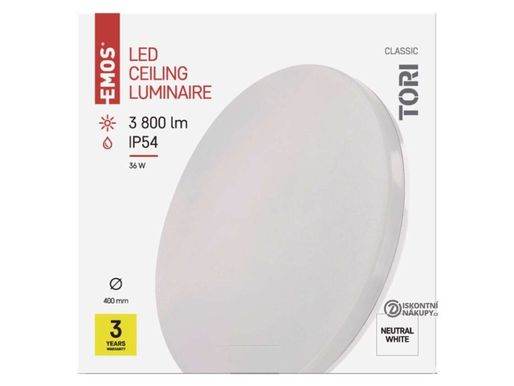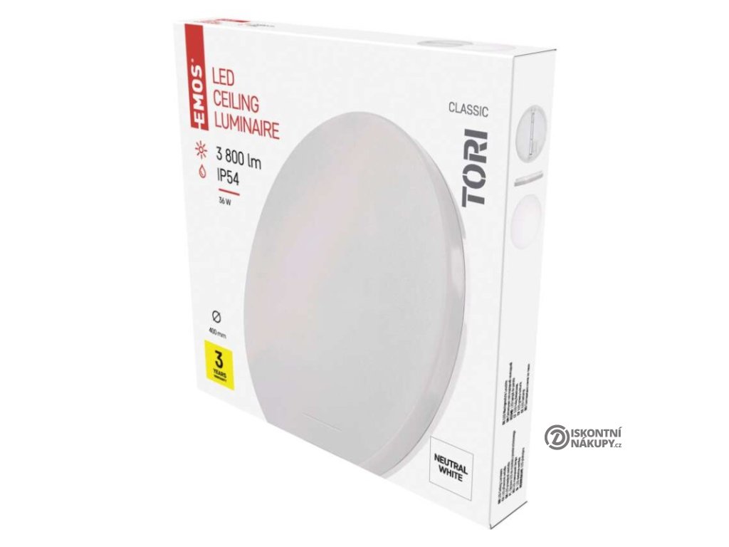 barva světla: neutrální bílá|barva těla: bílá|dálkový ovladač: ne|do chodby a na schodiště: ano|do dílny a garáže: ano|do kanceláře: ne|do koupelny: ano|do kuchyně: ano|do obýváku, ložnice a dětského pokoje: ne|dosah senzoru: neuvádí se|flicker-free: ano|frekvence: 50/60 Hz|index podání barev (CRI): Ra > 80|kategorie: CLASSIC|krytí: IP54|materiál difuzoru: plast (PC)|materiál LGP: neuvádí se|materiál těla: plast (PC)|montážní otvor: neuvádí se|možnost stmívání: ne|náhrada za žárovku: 215 W|napětí: 220–240 V|na zahradu a balkon: ano|pohybový senzor: ne|příkon: 36 W|prodejní obal: 1 ks, krabice|proud: 165 mA|řada: TORI|rozměr: 400 × 53 mm|světelná účinnost: 105 lm/W|světelný tok: 3 800 lm|teplota chromatičnosti: 4 000 K|tvar: kruh|typ difuzoru: mléčný|typ svítidla: klasické svítidlo|účiník: > 0,9|UGR<: neuvádí se|úhel vyzařování: 120°|umístění: stropní|výstupní proud ze zdroje: 400 mA|záruční doba: 3 roky|zdroj světla: LED|životnost: 30 000 hodin|způsob montáže: přisazenéVýhody produktu