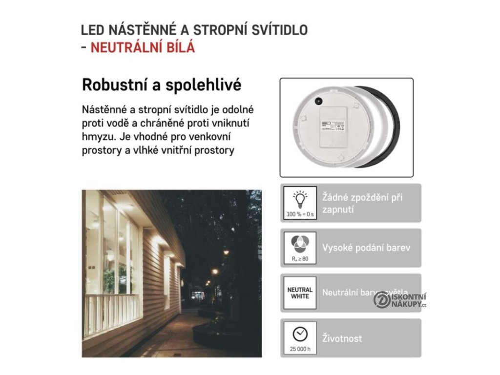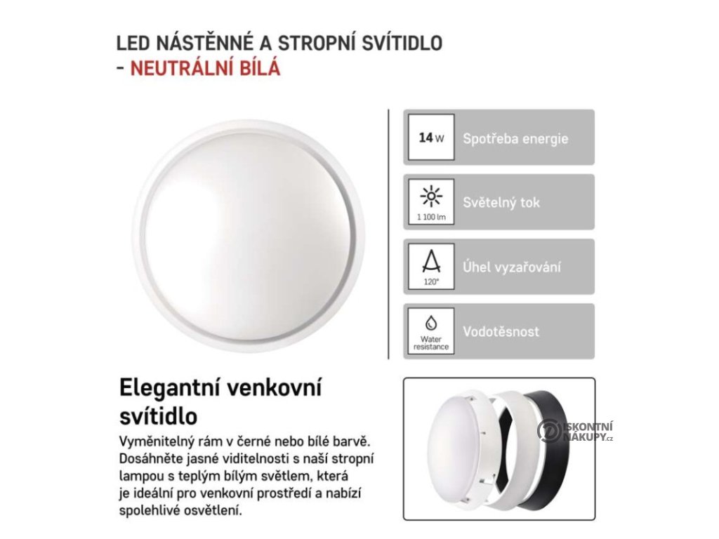 barva světla: neutrální bílá|barva těla: černá/bílá|dálkový ovladač: ne|do chodby a na schodiště: ano|do dílny a garáže: ano|do kanceláře: ne|do koupelny: ano|do kuchyně: ne|do obýváku, ložnice a dětského pokoje: ne|dosah senzoru: nemá senzor|flicker-free: ano|frekvence: 50/60 Hz|index podání barev (CRI): Ra > 80|kategorie: CLASSIC|krytí: IP54|materiál difuzoru: plast (PC)|materiál LGP: neuvádí se|materiál těla: plast (PC)|montážní otvor: neuvádí se|možnost stmívání: ne|náhrada za žárovku: 75 W|napětí: 220–240 V|na zahradu a balkon: ano|pohybový senzor: ne|příkon: 14 W|prodejní obal: 1 ks, krabice|proud: 120 mA|řada: ZURI|rozměr: průměr 215 × 80 mm|světelná účinnost: 71 lm/W|světelný tok: 1 100 lm|teplota chromatičnosti: 4 000 K|tvar: kruh|typ difuzoru: mléčný|typ svítidla: klasické svítidlo|účiník: > 0,5|UGR<: neuvádí se|úhel vyzařování: 120°|umístění: stropní/nástěnné|výstupní proud ze zdroje: neuvádí se|záruční doba: 2 roky|zdroj světla: LED|životnost: 25 000 hodin|způsob montáže: přisazenéDoplňkové parametry