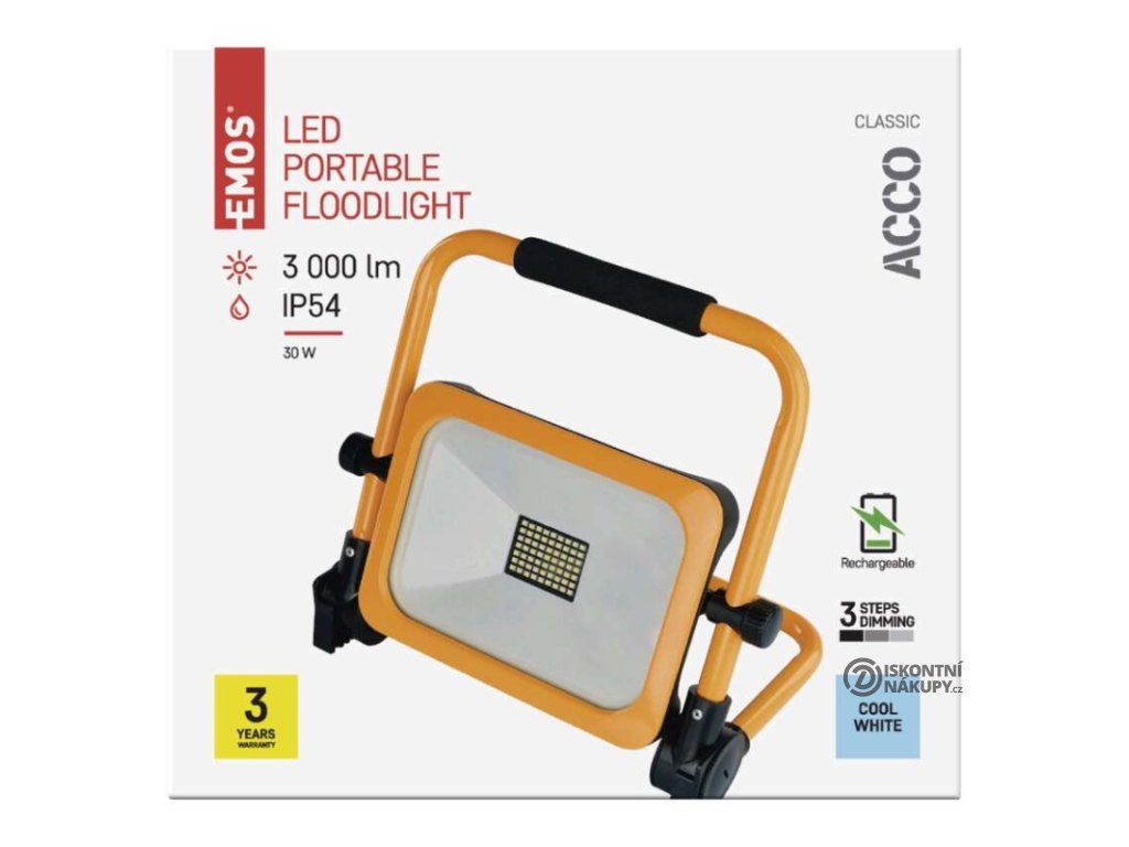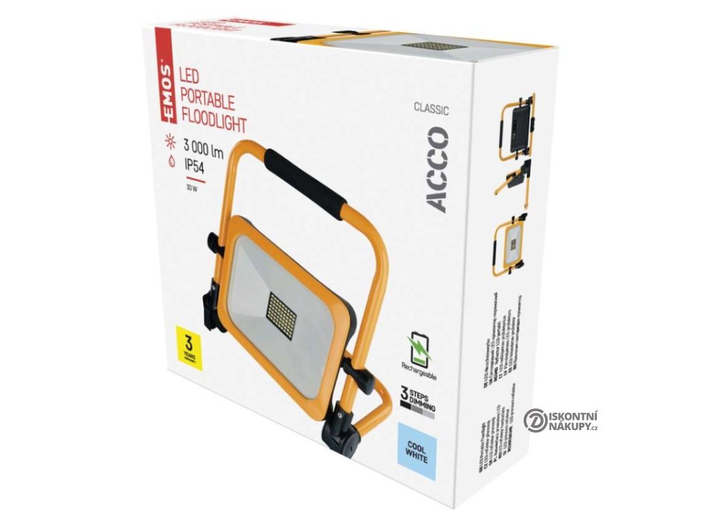 akumulátor: Li-Ion 10 000 mAh|barva: žlutá|barva světla: studená bílá|délka přívodního kabelu: neuvádí se|doba svícení na AKU: 3 – 10 hodin|dosah PIR senzoru: nemá PIR|energetická třída použitého světelného zdroje: neuvádí se|flicker-free: ano|frekvence: neuvádí se|index podání barev (CRI): Ra > 80|kategorie: CLASSIC|krytí: IP54|materiál difuzoru: sklo|materiál přívodního kabelu: neuvádí se|materiál těla: hliník|napájení: akumulátor|napětí: 5 V DC 220–240 V AC|PIR senzor: ne|počet průchozích zásuvek: 0|použití: přenosné|příkon: 30 W|prodejní obal: 1 ks, krabice|proud: 2 100 mA|řada: ACCO|rozměr: 292 × 219 × 273 mm|rozsah pracovní teploty: -20 °C až +40 °C|stmívání: ano|stupeň ochrany proti mechanickým nárazům: neuvádí se|světelná účinnost: 100 lm/W|světelný tok: 3 000 lm|teplota chromatičnosti: 6 500 K|typ přívodního kabelu: neuvádí se|typ průchozích zásuvek: neuvádí se|účiník: > 0,9|úhel vyzařování: 120°|záruční doba: 3 roky|zdroj světla: LED|životnost: 25 000 hodin|zkušební žárovka součástí balení: neuvádí seVýhody produktu