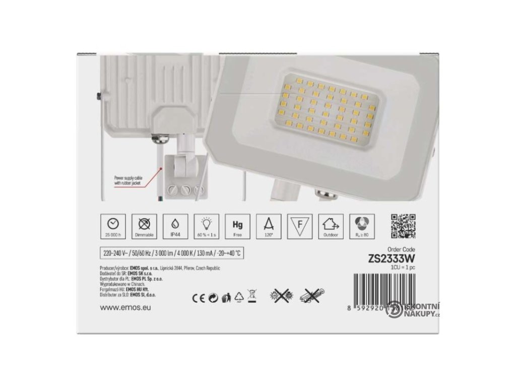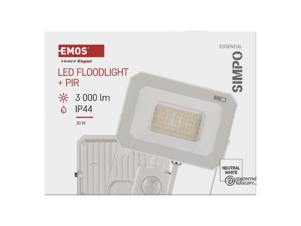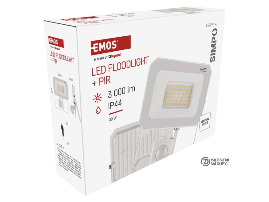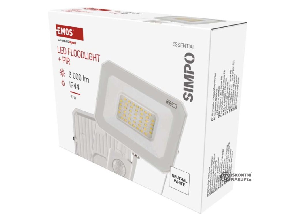 akumulátor: ne|barva: bílá|barva světla: neutrální bílá|délka přívodního kabelu: 20 cm|doba svícení na AKU: neuvádí se|dosah PIR senzoru: 8 m|energetická třída použitého světelného zdroje: F|flicker-free: ano|frekvence: 50/60 Hz|index podání barev (CRI): Ra > 80|kategorie: ESSENTIAL|krytí: IP44|materiál difuzoru: sklo|materiál přívodního kabelu: guma|materiál těla: hliník|napájení: ze sítě|napětí: 220–240 V~|PIR senzor: ano|počet průchozích zásuvek: neuvádí se|použití: povrchová montáž|příkon: 30 W|prodejní obal: 1 ks, krabice|proud: 130 mA|řada: SIMPO|rozměr: 143 × 175 × 52 mm|rozsah pracovní teploty: -20 °C až +40 °C|stmívání: ne|stupeň ochrany proti mechanickým nárazům: neuvádí se|světelná účinnost: 100 lm/W|světelný tok: 3 000 lm|teplota chromatičnosti: 4 000 K|typ přívodního kabelu: H05RN-F|typ průchozích zásuvek: neuvádí se|typ stmívání: –|účiník: > 0,9|úhel vyzařování: 120°|záruční doba: 2 roky|zdroj světla: LED|životnost: 15 000 hodin|zkušební žárovka součástí balení: neDoplňkové parametry