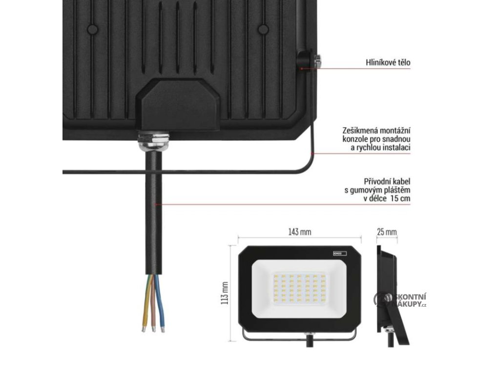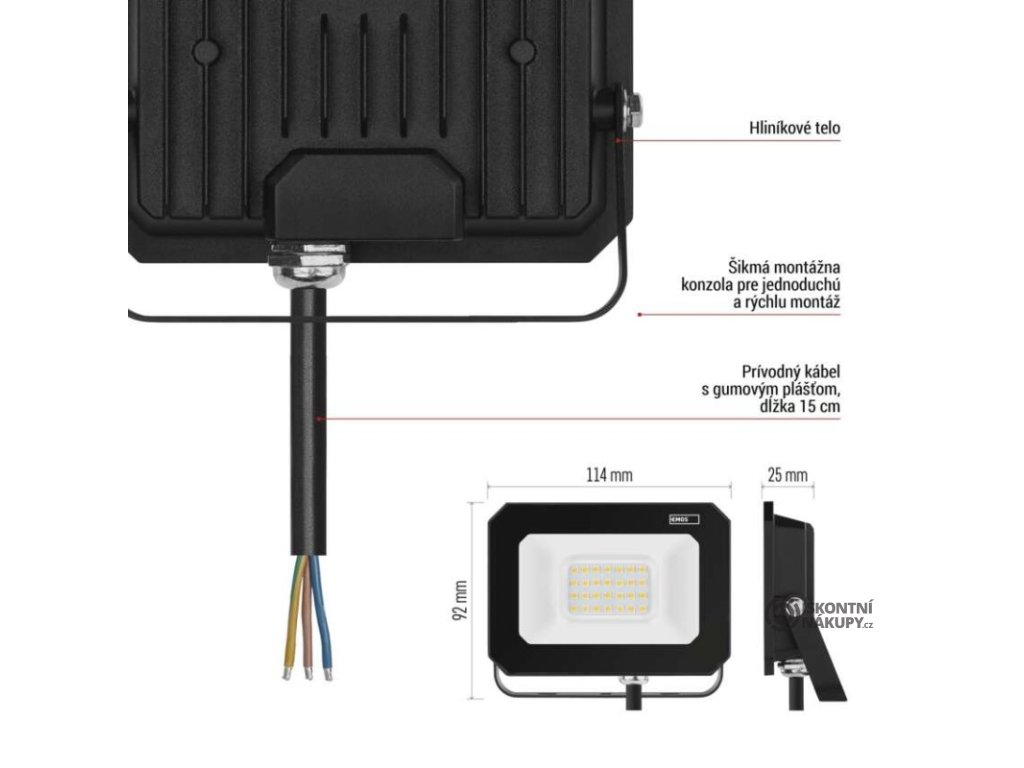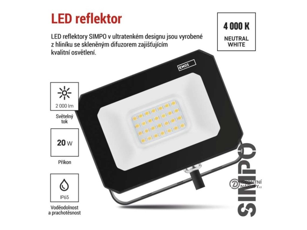 akumulátor: ne|barva: černá|barva světla: neutrální bílá|délka přívodního kabelu: 20 cm|doba svícení na AKU: neuvádí se|dosah PIR senzoru: nemá PIR|energetická třída použitého světelného zdroje: F|flicker-free: ano|frekvence: 50/60 Hz|index podání barev (CRI): Ra > 80|kategorie: ESSENTIAL|krytí: IP65|materiál difuzoru: sklo|materiál přívodního kabelu: guma|materiál těla: hliník|napájení: ze sítě|napětí: 220–240 V~|PIR senzor: ne|počet průchozích zásuvek: neuvádí se|použití: závěsná montáž|příkon: 20 W|prodejní obal: 1 ks, krabice|proud: 90 mA|řada: SIMPO|rozměr: 114 × 92 × 25 mm|rozsah pracovní teploty: -20 °C až +40 °C|stmívání: ne|stupeň ochrany proti mechanickým nárazům: neuvádí se|světelná účinnost: 100 lm/W|světelný tok: 2 000 lm|teplota chromatičnosti: 4 000 K|typ přívodního kabelu: H05RN-F|typ průchozích zásuvek: neuvádí se|účiník: > 0,7|úhel vyzařování: 120°|záruční doba: 2 roky|zdroj světla: LED|životnost: 25 000 hodin|zkušební žárovka součástí balení: neDoplňkové parametry