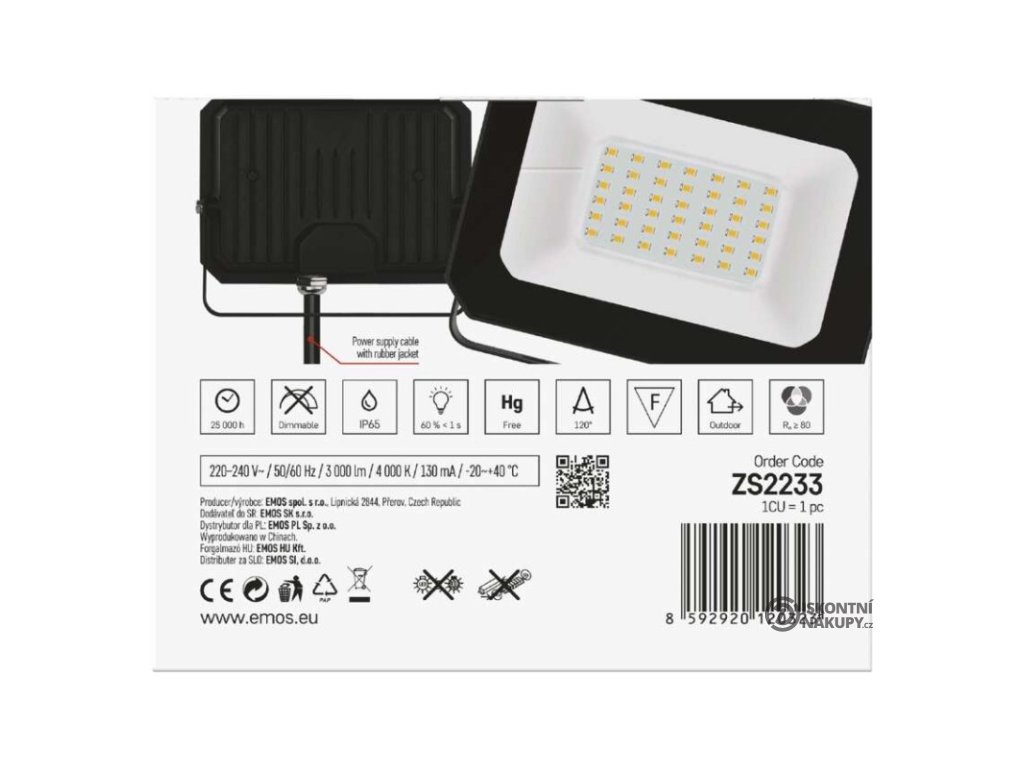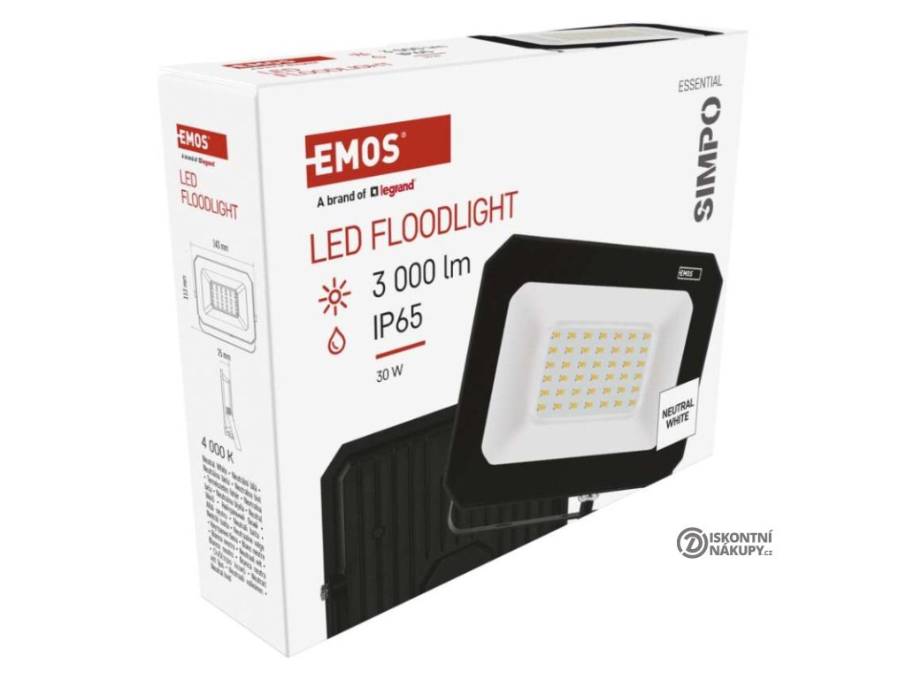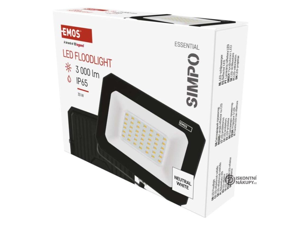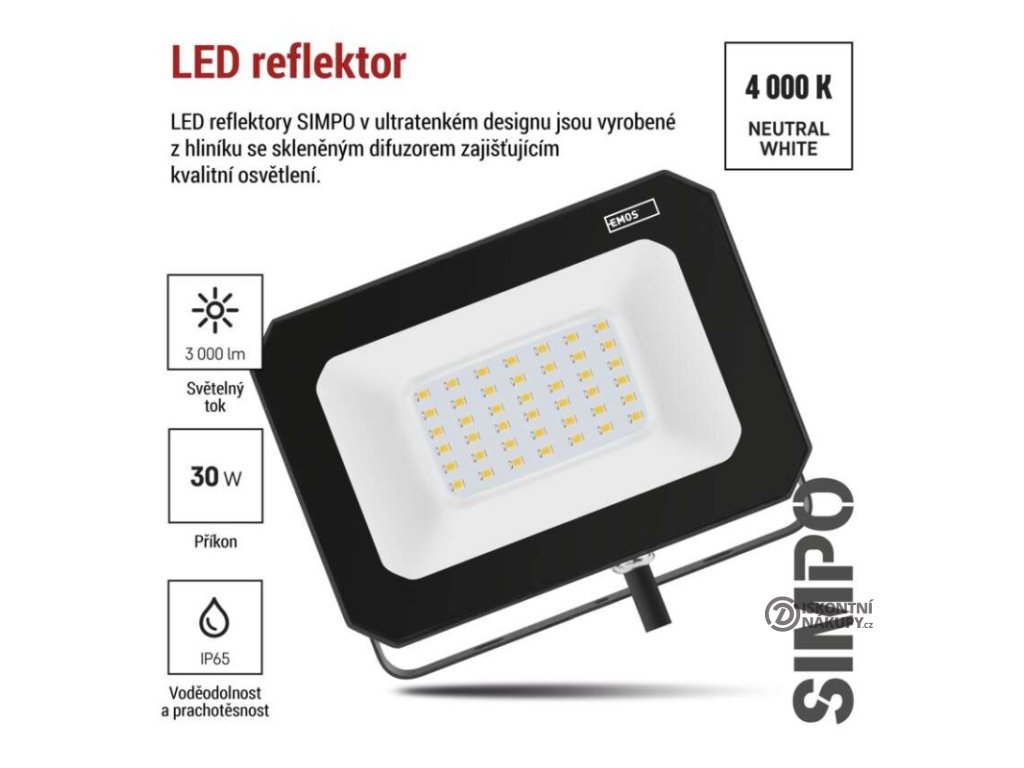 akumulátor: ne|barva: černá|barva světla: neutrální bílá|délka přívodního kabelu: 20 cm|doba svícení na AKU: neuvádí se|dosah PIR senzoru: nemá PIR|energetická třída použitého světelného zdroje: F|flicker-free: ano|frekvence: 50/60 Hz|index podání barev (CRI): Ra > 80|kategorie: ESSENTIAL|krytí: IP65|materiál difuzoru: sklo|materiál přívodního kabelu: guma|materiál těla: hliník|napájení: ze sítě|napětí: 220–240 V~|PIR senzor: ne|počet průchozích zásuvek: neuvádí se|použití: závěsná montáž|příkon: 30 W|prodejní obal: 1 ks, krabice|proud: 130 mA|řada: SIMPO|rozměr: 143 × 113 ×25 mm|rozsah pracovní teploty: -20 °C až +40 °C|stmívání: ne|stupeň ochrany proti mechanickým nárazům: neuvádí se|světelná účinnost: 100 lm/W|světelný tok: 3 000 lm|teplota chromatičnosti: 4 000 K|typ přívodního kabelu: H05RN-F|typ průchozích zásuvek: neuvádí se|účiník: > 0,9|úhel vyzařování: 120°|záruční doba: 2 roky|zdroj světla: LED|životnost: 25 000 hodin|zkušební žárovka součástí balení: neDoplňkové parametry
