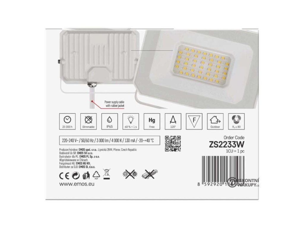 akumulátor: ne|barva: bílá|barva světla: neutrální bílá|délka přívodního kabelu: 20 cm|doba svícení na AKU: neuvádí se|dosah PIR senzoru: nemá PIR|energetická třída použitého světelného zdroje: F|flicker-free: ano|frekvence: 50/60 Hz|index podání barev (CRI): Ra > 80|kategorie: ESSENTIAL|krytí: IP65|materiál difuzoru: sklo|materiál přívodního kabelu: guma|materiál těla: hliník|napájení: ze sítě|napětí: 220–240 V~|PIR senzor: ne|počet průchozích zásuvek: neuvádí se|použití: povrchová montáž|příkon: 30 W|prodejní obal: 1 ks, krabice|proud: 130 mA|řada: SIMPO|rozměr: 143 × 113 ×25 mm|rozsah pracovní teploty: -20 °C až +40 °C|stmívání: ne|stupeň ochrany proti mechanickým nárazům: neuvádí se|světelná účinnost: 100 lm/W|světelný tok: 3 000 lm|teplota chromatičnosti: 4 000 K|typ přívodního kabelu: H05RN-F|typ průchozích zásuvek: neuvádí se|typ stmívání: –|účiník: > 0,9|úhel vyzařování: 120°|záruční doba: 2 roky|zdroj světla: LED|životnost: 15 000 hodin|zkušební žárovka součástí balení: neDoplňkové parametry