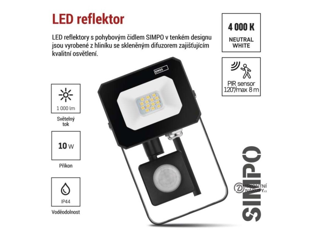 LED reflektor SIMPO s pohybovým čidlem, 10 W, černý, neutrální bílá