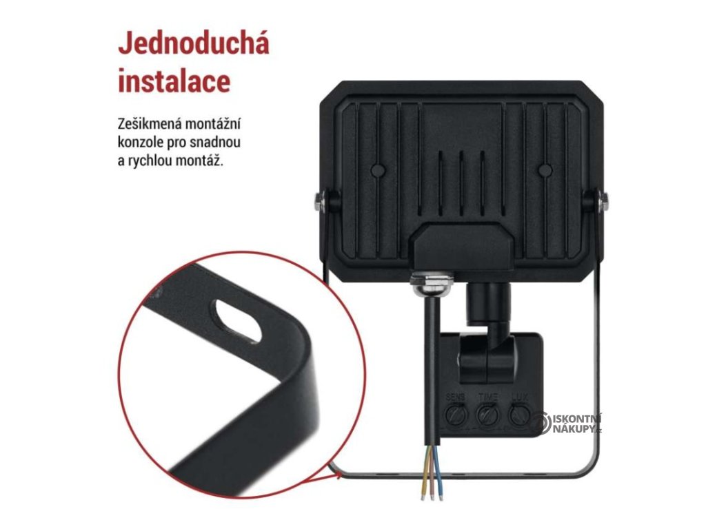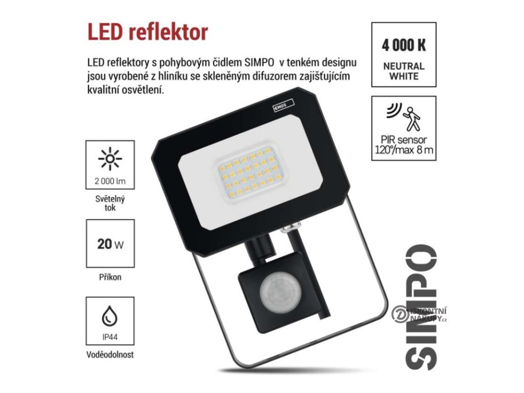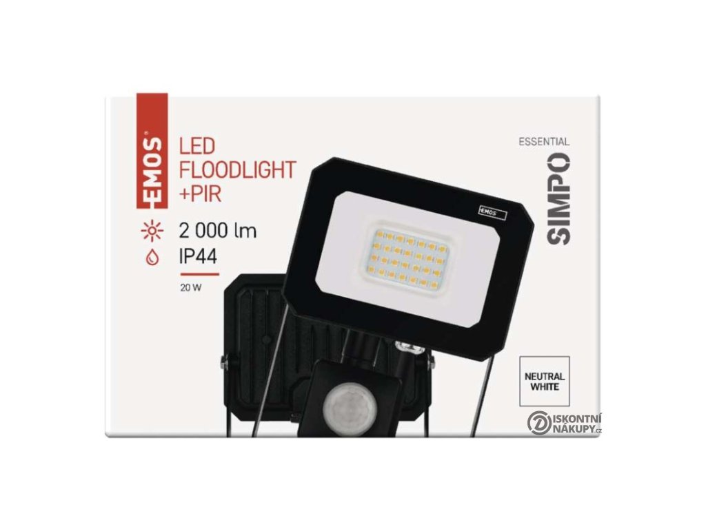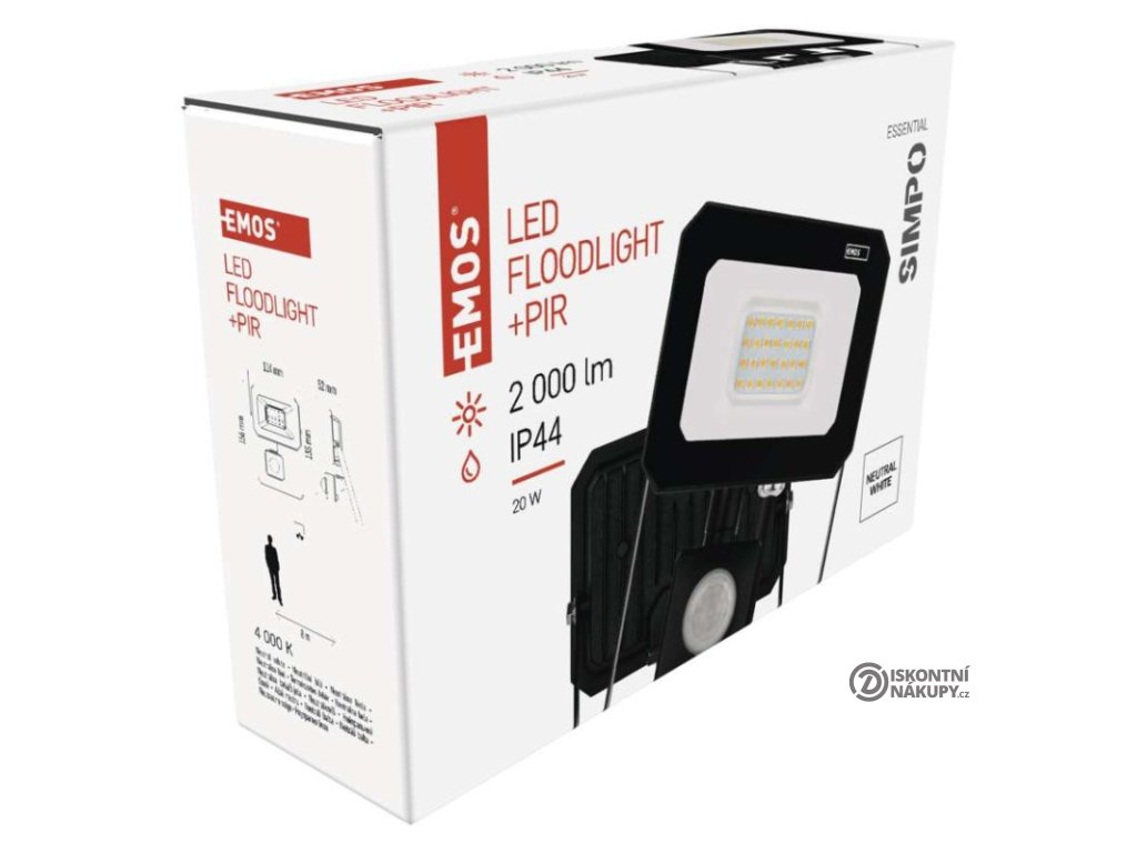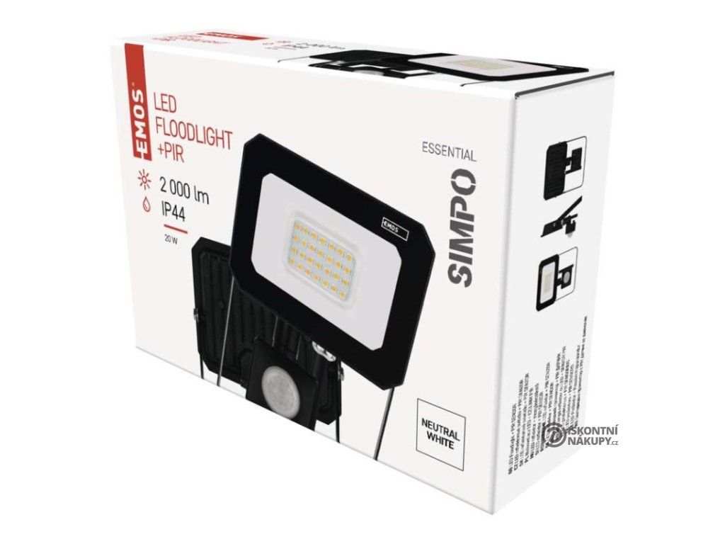 akumulátor: ne|barva: černá|barva světla: neutrální bílá|délka přívodního kabelu: 20 cm|doba svícení na AKU: neuvádí se|dosah PIR senzoru: 8 m|energetická třída použitého světelného zdroje: F|flicker-free: ano|frekvence: 50/60 Hz|index podání barev (CRI): Ra > 80|kategorie: ESSENTIAL|krytí: IP44|materiál difuzoru: sklo|materiál přívodního kabelu: guma|materiál těla: hliník|napájení: ze sítě|napětí: 220–240 V~|PIR senzor: ano|počet průchozích zásuvek: neuvádí se|použití: závěsná montáž|příkon: 20 W|prodejní obal: 1 ks, krabice|proud: 90 mA|řada: SIMPO|rozměr: 114 × 156 × 52 mm|rozsah pracovní teploty: -20 °C až +40 °C|stmívání: ne|stupeň ochrany proti mechanickým nárazům: neuvádí se|světelná účinnost: 100 lm/W|světelný tok: 2 000 lm|teplota chromatičnosti: 4 000 K|typ přívodního kabelu: H05RN-F|typ průchozích zásuvek: neuvádí se|účiník: > 0,7|úhel vyzařování: 120°|záruční doba: 2 roky|zdroj světla: LED|životnost: 25 000 hodin|zkušební žárovka součástí balení: neDoplňkové parametry