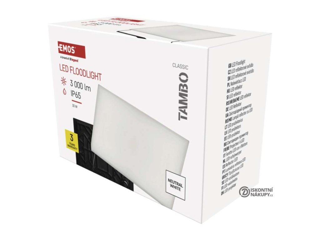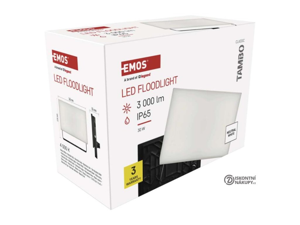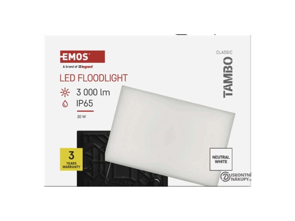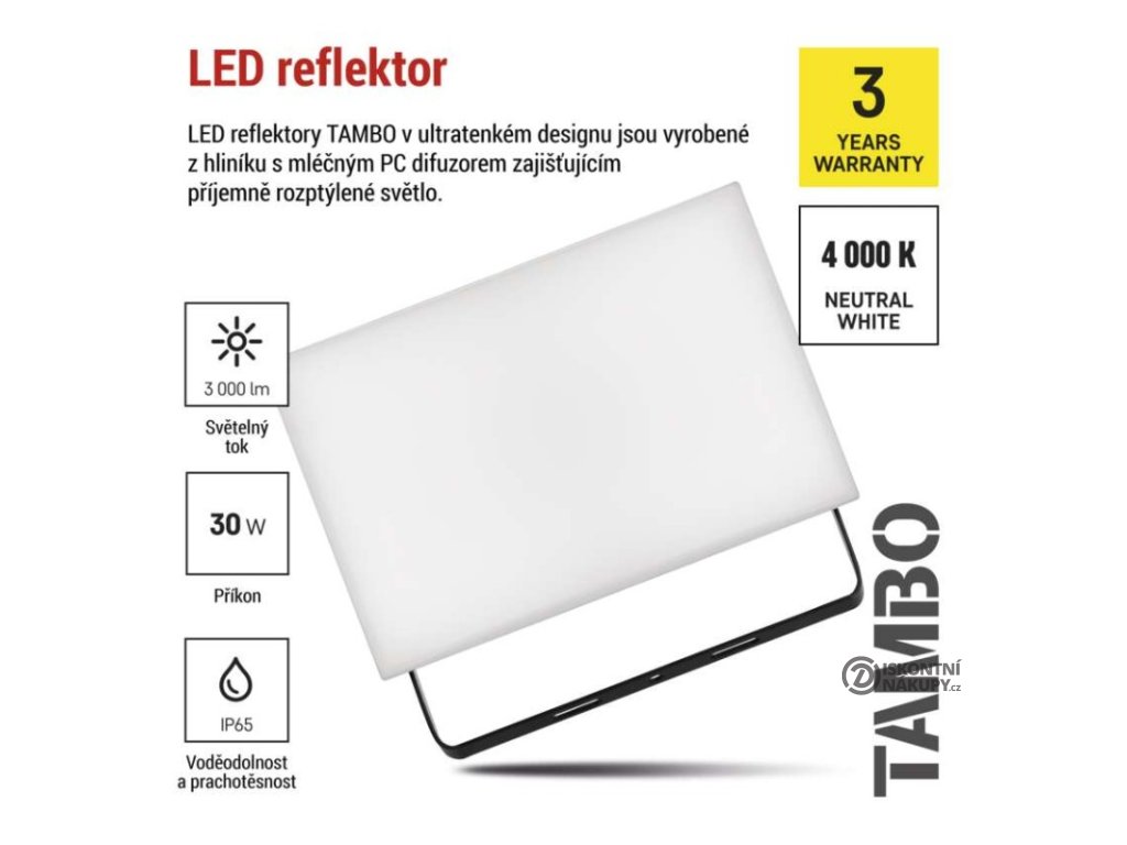 akumulátor: neuvádí se|barva: černá|barva světla: neutrální bílá|délka přívodního kabelu: 30 cm|doba svícení na AKU: neuvádí se|dosah PIR senzoru: nemá PIR|energetická třída použitého světelného zdroje: F|flicker-free: ano|frekvence: 50/60 Hz|index podání barev (CRI): Ra > 80|kategorie: CLASSIC|krytí: IP65|materiál difuzoru: plast (PC)|materiál přívodního kabelu: guma|materiál těla: hliník|napájení: ze sítě|napětí: 220–240 V~|PIR senzor: ne|počet průchozích zásuvek: 0|použití: povrchová montáž|příkon: 30 W|prodejní obal: 1 ks, krabice|proud: 130 mA|řada: TAMBO|rozměr: 165 × 114 × 55 mm|rozsah pracovní teploty: -20 °C až +40 °C|stmívání: ne|stupeň ochrany proti mechanickým nárazům: IK08|světelná účinnost: 100 lm/W|světelný tok: 3 000 lm|teplota chromatičnosti: 4 000 K|typ přívodního kabelu: neuvádí se|typ průchozích zásuvek: neuvádí se|typ stmívání: –|účiník: > 0,9|úhel vyzařování: 120°|záruční doba: 3 roky|zdroj světla: LED|životnost: 25 000 hodin|zkušební žárovka součástí balení: neDoplňkové parametry