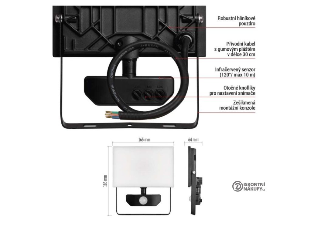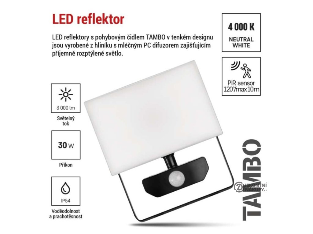 akumulátor: neuvádí se|barva: černá|barva světla: neutrální bílá|délka přívodního kabelu: 30 cm|doba svícení na AKU: neuvádí se|dosah PIR senzoru: 10 m|energetická třída použitého světelného zdroje: F|flicker-free: ano|frekvence: 50/60 Hz|index podání barev (CRI): Ra > 80|kategorie: CLASSIC|krytí: IP54|materiál difuzoru: plast (PC)|materiál přívodního kabelu: guma|materiál těla: hliník|napájení: ze sítě|napětí: 220–240 V~|PIR senzor: ano|počet průchozích zásuvek: 0|použití: povrchová montáž|příkon: 30 W|prodejní obal: 1 ks, krabice|proud: 135 mA|řada: TAMBO|rozměr: 165 × 185 × 64 mm|rozsah pracovní teploty: -20 °C až +40 °C|stmívání: ne|stupeň ochrany proti mechanickým nárazům: IK06|světelná účinnost: 100 lm/W|světelný tok: 3 000 lm|teplota chromatičnosti: 4 000 K|typ přívodního kabelu: neuvádí se|typ průchozích zásuvek: neuvádí se|typ stmívání: –|účiník: > 0,9|úhel vyzařování: 120°|záruční doba: 3 roky|zdroj světla: LED|životnost: 25 000 hodin|zkušební žárovka součástí balení: neDoplňkové parametry