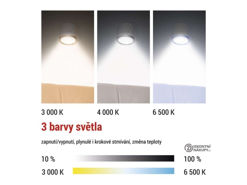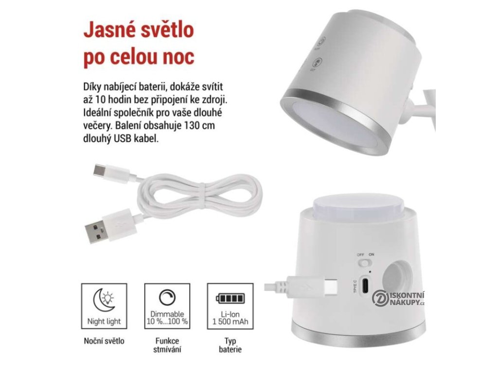 barva: bílá|barva světla: teplá/neutrální/studená bílá|činitel stárnutí: 0,96|čip LED: SMD|délka přívodního kabelu: 1,3 m|energetická třída: neuvádí se|energetická třída (od 1.9.2021): neuvádí se|index podání barev (CRI): Ra >80|integrovaná nabíjecí baterie: ano|krytí: IP20|materiál: hliník/plast|max. výkon: 6 W|napájecí zdroj: USB|napájecí zdroj součástí balení: ano|napětí: 3,7 V|obsah rtuti: neuvádí se|patice (uchycení žárovky): neuvádí se|počet LED: neuvádí se|počet spínacích cyklů: neuvádí se|příkon: 6 W|prodejní obal: 1 ks, krabice|rozměr: 250 × 100 mm|rychlost náběhu na 100 %: neuvádí se|stmívání: ano|světelný tok: 300 lm|teplota chromatičnosti: 3 000/4 000/6 500 K|typ napájení: USB|účiník: neuvádí se|USB port: ano|životnost: neuvádí seDoplňkové parametry