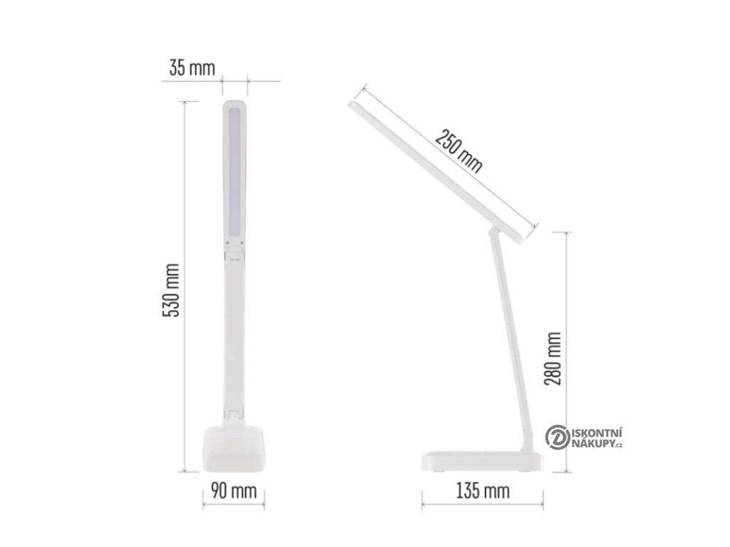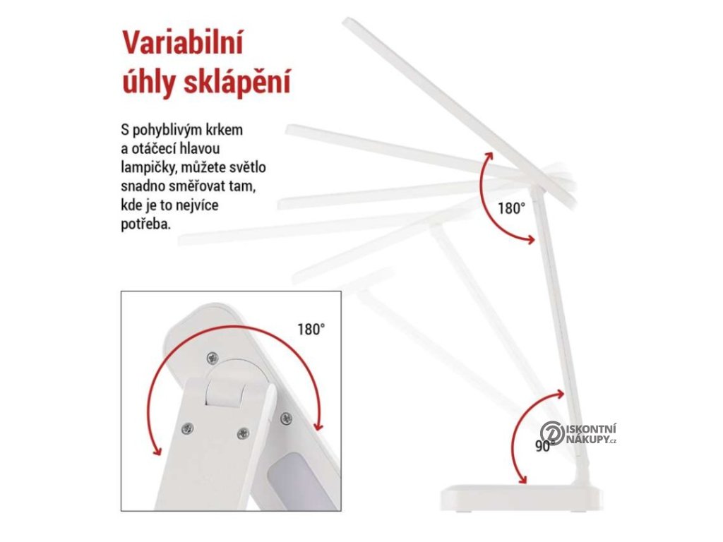 barva: bílá|barva světla: teplá/neutrální/studená bílá|činitel stárnutí: 0,96|čip LED: SMD|délka přívodního kabelu: 1,2 m|energetická třída: neuvádí se|energetická třída (od 1.9.2021): neuvádí se|index podání barev (CRI): Ra >80|integrovaná nabíjecí baterie: ano|krytí: IP20|materiál: ABS plast|max. výkon: 5 W|napájecí zdroj: USB|napájecí zdroj součástí balení: ne|napětí: 3,7 V|obsah rtuti: neuvádí se|patice (uchycení žárovky): neuvádí se|počet LED: 30|počet spínacích cyklů: neuvádí se|příkon: 5 W|prodejní obal: 1 ks, krabice|rozměr: 250 × 240 mm|rychlost náběhu na 100 %: neuvádí se|stmívání: ano|světelný tok: 200 lm|teplota chromatičnosti: 3 000–6 500 K|typ napájení: USB|účiník: neuvádí se|USB port: ne|životnost: neuvádí seDoplňkové parametry