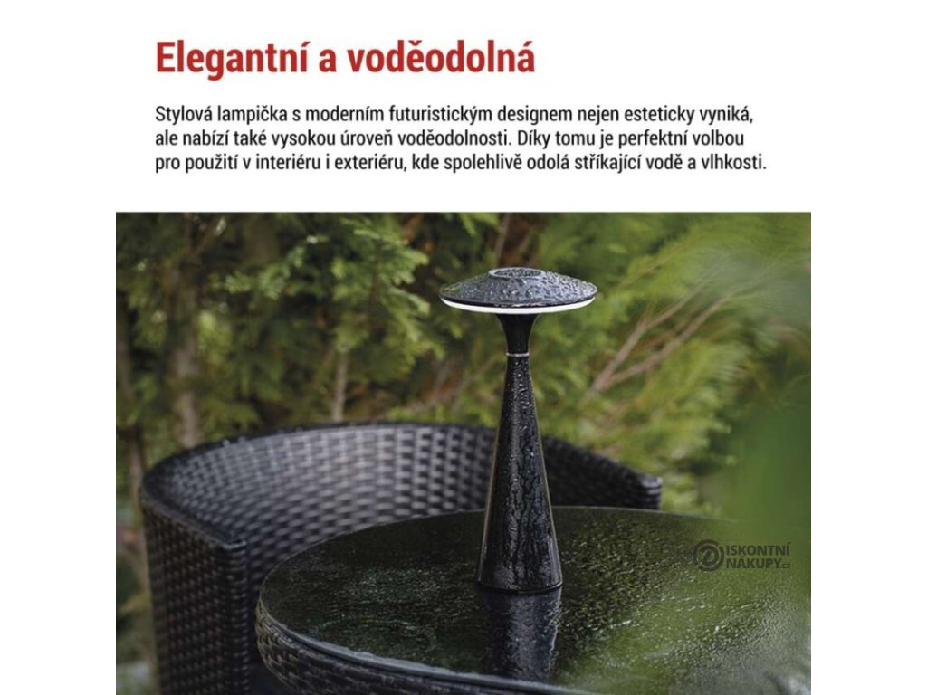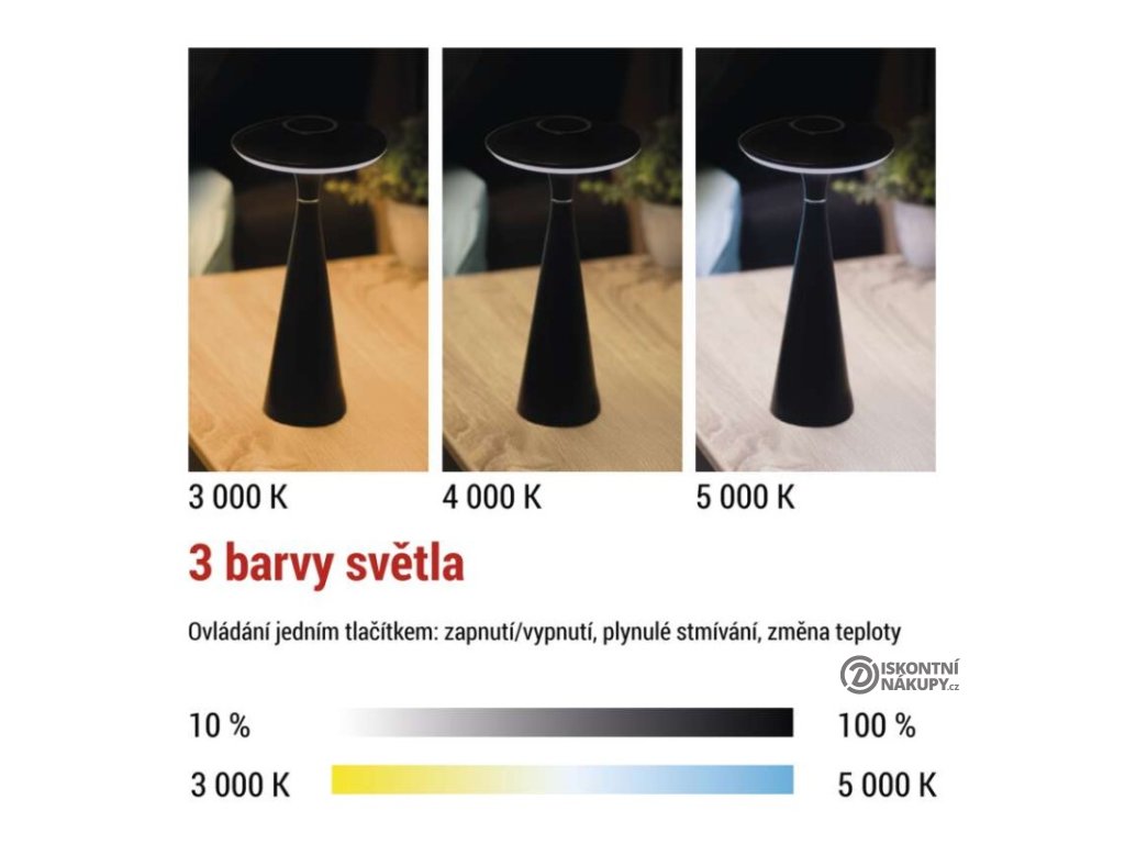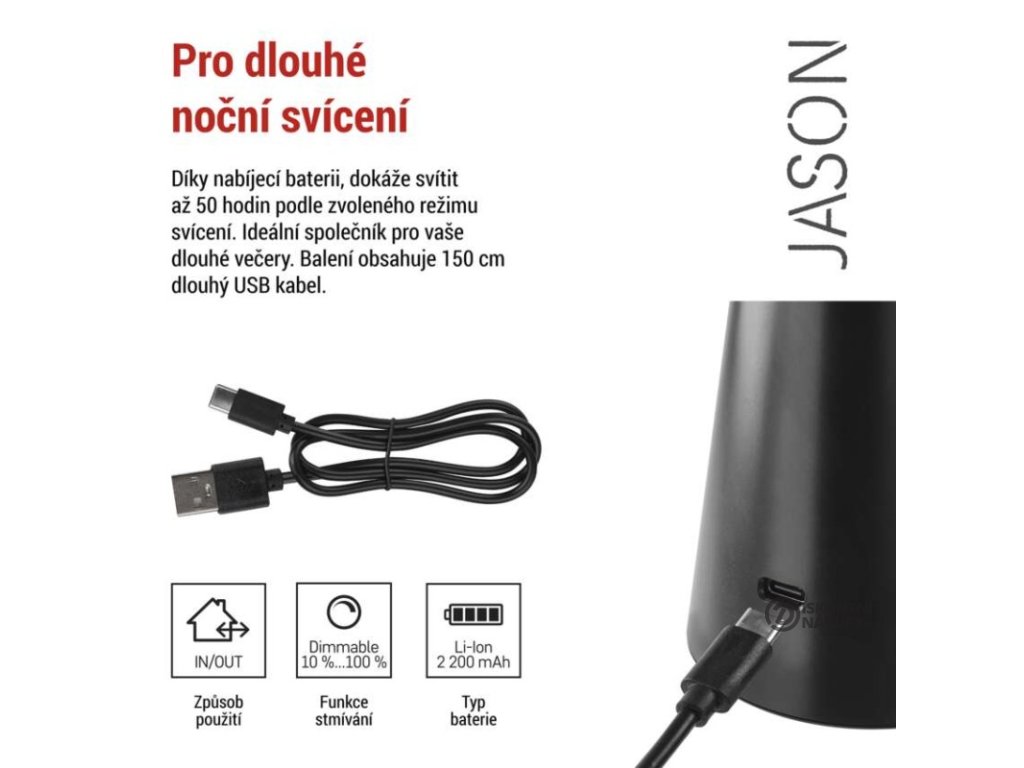 barva: černá|barva světla: teplá/neutrální/studená bílá|činitel stárnutí: 0,96|čip LED: SMD|délka přívodního kabelu: 1,5 m|energetická třída: neuvádí se|energetická třída (od 1.9.2021): neuvádí se|index podání barev (CRI): Ra >80|integrovaná nabíjecí baterie: ano|krytí: IP44|materiál: ABS plast|max. výkon: neuvádí se|napájecí zdroj: USB|napájecí zdroj součástí balení: ne|napětí: 3,7 V|obsah rtuti: neuvádí se|patice (uchycení žárovky): neuvádí se|počet LED: neuvádí se|počet spínacích cyklů: neuvádí se|příkon: 2,2 W|prodejní obal: 1 ks, krabice|rozměr: 270 × 130 mm|rychlost náběhu na 100 %: neuvádí se|stmívání: ano|světelný tok: 180 lm|teplota chromatičnosti: 3 000/4 000/5 000 K|typ napájení: USB|účiník: neuvádí se|USB port: ano|životnost: neuvádí seDoplňkové parametry