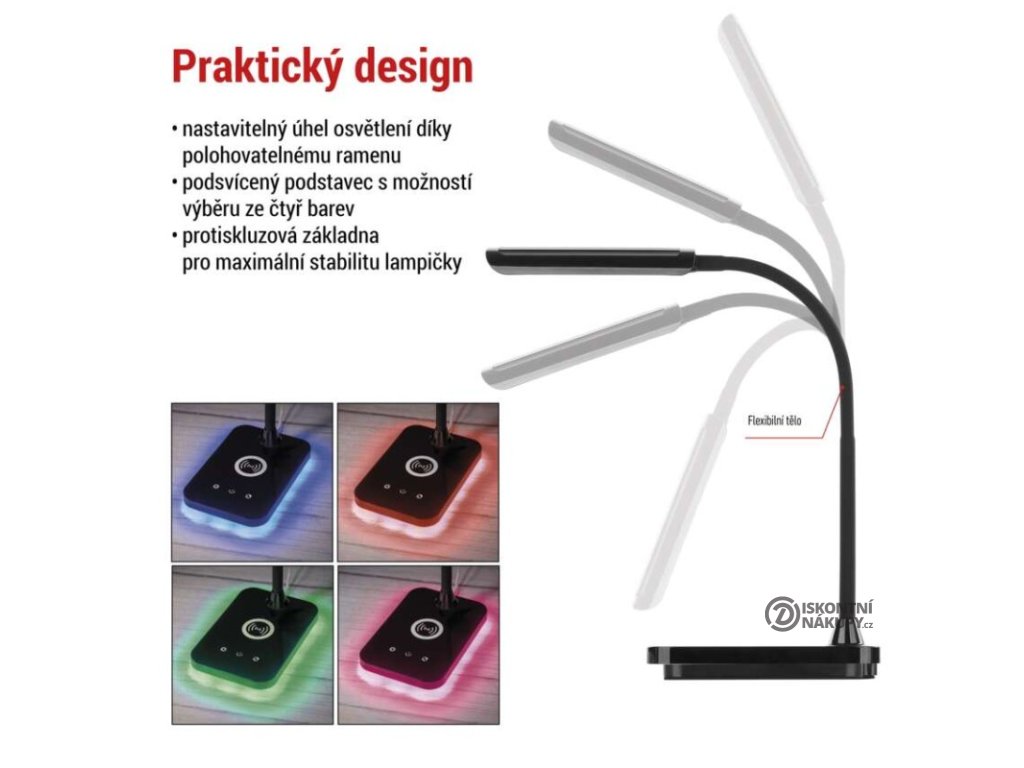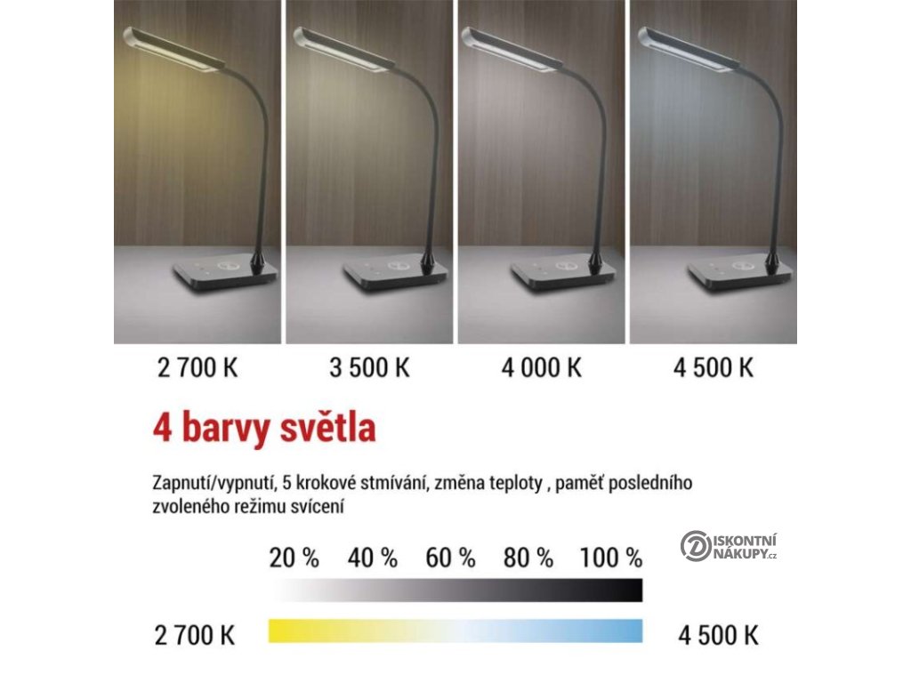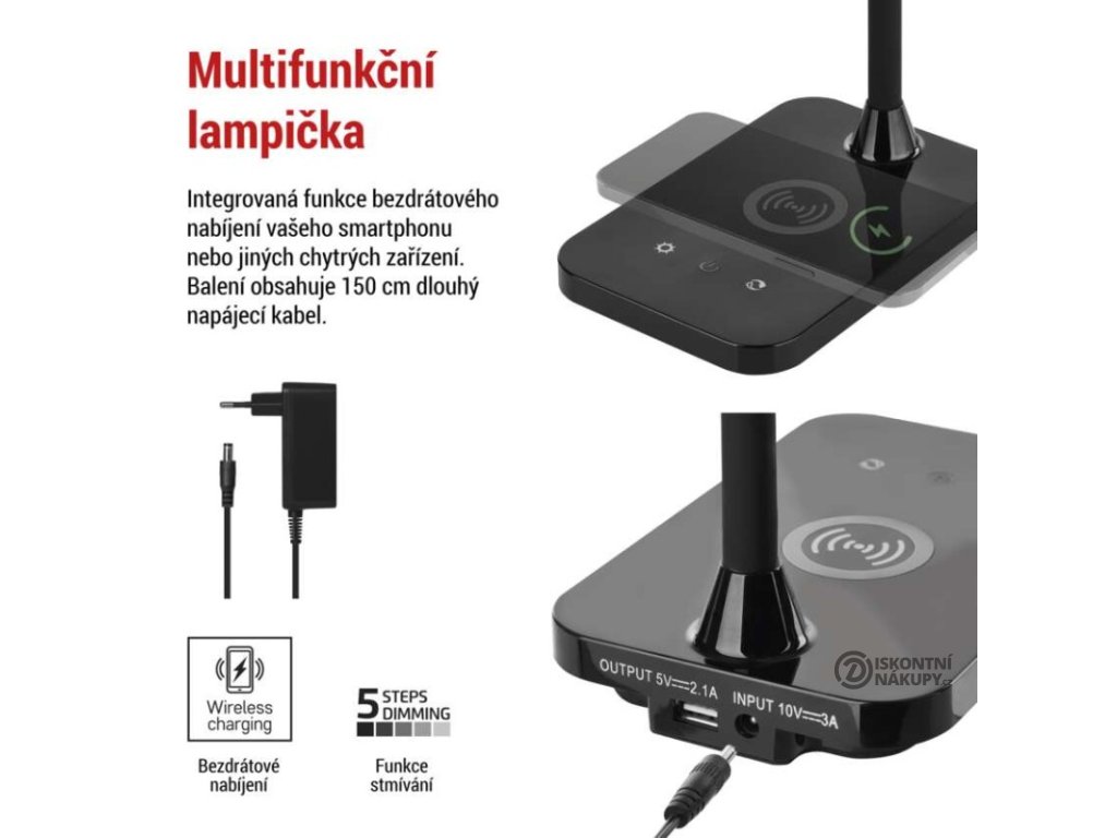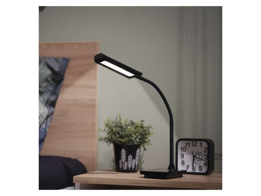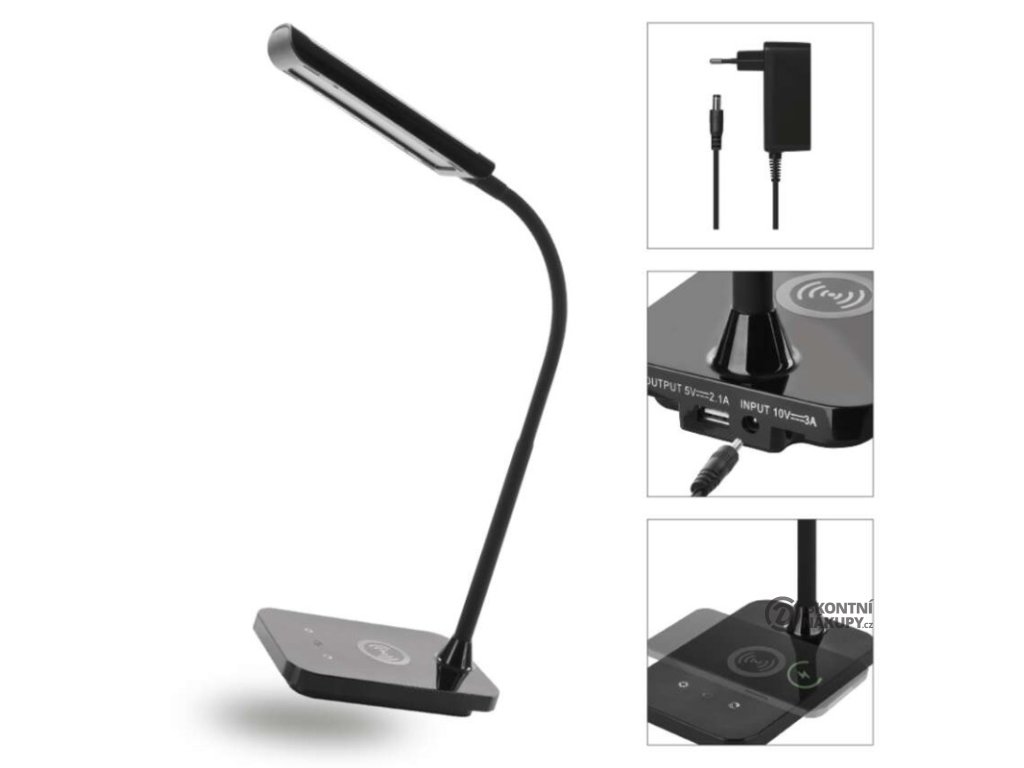 barva: černá|barva světla: teplá/neutrální/studená bílá|činitel stárnutí: 0,96|čip LED: SMD|délka přívodního kabelu: 1,5 m|energetická třída: neuvádí se|energetická třída (od 1.9.2021): neuvádí se|index podání barev (CRI): Ra > 90|integrovaná nabíjecí baterie: ne|krytí: IP20|materiál: ABS plast|max. výkon: 5,5 W|napájecí zdroj: 10 V/3 000 mA|napájecí zdroj součástí balení: ano|napětí: 220–240 V|obsah rtuti: neuvádí se|patice (uchycení žárovky): neuvádí se|počet LED: neuvádí se|počet spínacích cyklů: neuvádí se|příkon: 5,5 W|prodejní obal: 1 ks, krabice|rozměr: 350 mm|rychlost náběhu na 100 %: neuvádí se|stmívání: ano|světelný tok: 300 lm|teplota chromatičnosti: 2 700–4 500 K|typ napájení: síť|účiník: neuvádí se|USB port: ano + bezdrátové nabíjení|životnost: neuvádí seDoplňkové parametry