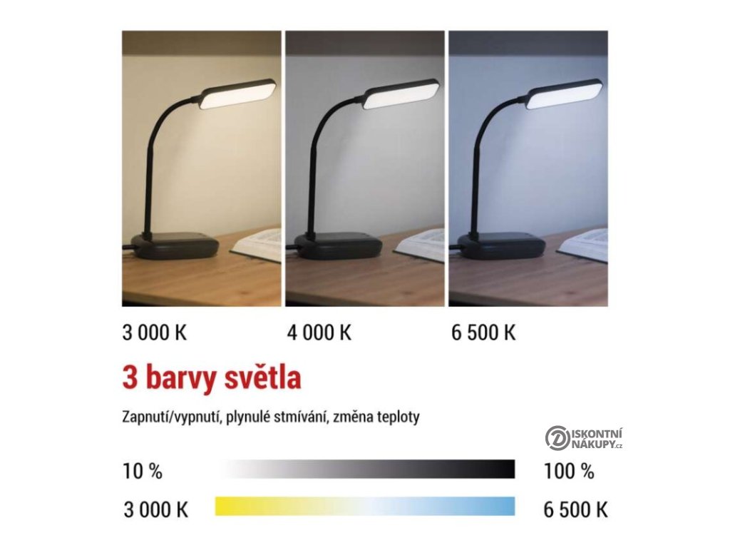 barva: černá|barva světla: teplá/neutrální/studená bílá|činitel stárnutí: 0,96|čip LED: SMD|délka přívodního kabelu: 1,5 m|energetická třída: neuvádí se|energetická třída (od 1.9.2021): neuvádí se|index podání barev (CRI): Ra >80|integrovaná nabíjecí baterie: ne|krytí: IP20|materiál: ABS plast|max. výkon: 12 W|napájecí zdroj: 10 V/1 A|napájecí zdroj součástí balení: ano|napětí: 220–240 V|obsah rtuti: neuvádí se|patice (uchycení žárovky): neuvádí se|počet LED: neuvádí se|počet spínacích cyklů: neuvádí se|příkon: 12 W|prodejní obal: 1 ks, krabice|rozměr: 30 cm|rychlost náběhu na 100 %: neuvádí se|stmívání: ano|světelný tok: 650 lm|teplota chromatičnosti: 3 000/4 000/6 500 K|typ napájení: síť|účiník: neuvádí se|USB port: ne|životnost: neuvádí seDoplňkové parametry