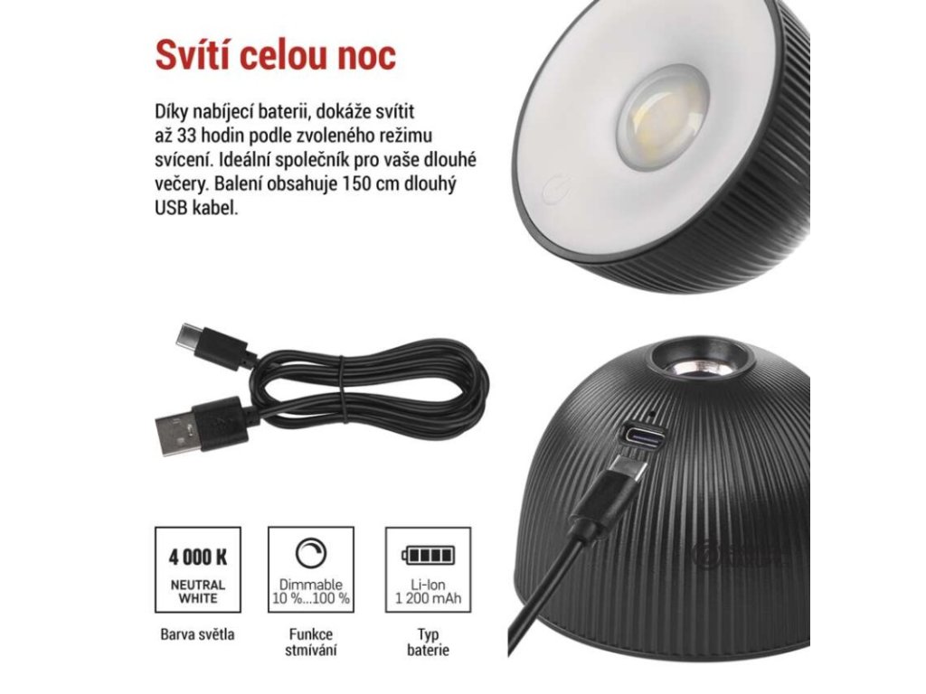barva: černá|barva světla: neutrální bílá|činitel stárnutí: 0,96|čip LED: SMD|délka přívodního kabelu: 1,5 m USB|energetická třída: neuvádí se|energetická třída (od 1.9.2021): neuvádí se|index podání barev (CRI): Ra >80|integrovaná nabíjecí baterie: ano|krytí: IP20|materiál: ABS plast|max. výkon: 2,5 W|napájecí zdroj: USB|napájecí zdroj součástí balení: ano|napětí: 3,7 V|obsah rtuti: neuvádí se|patice (uchycení žárovky): neuvádí se|počet LED: neuvádí se|počet spínacích cyklů: neuvádí se|příkon: 4,2 W|prodejní obal: 1 ks, krabice|rozměr: 400 × 110 mm|rychlost náběhu na 100 %: neuvádí se|stmívání: ano|světelný tok: 200 lm|teplota chromatičnosti: 4 000 K|typ napájení: USB|účiník: neuvádí se|USB port: ano|životnost: neuvádí seDoplňkové parametry