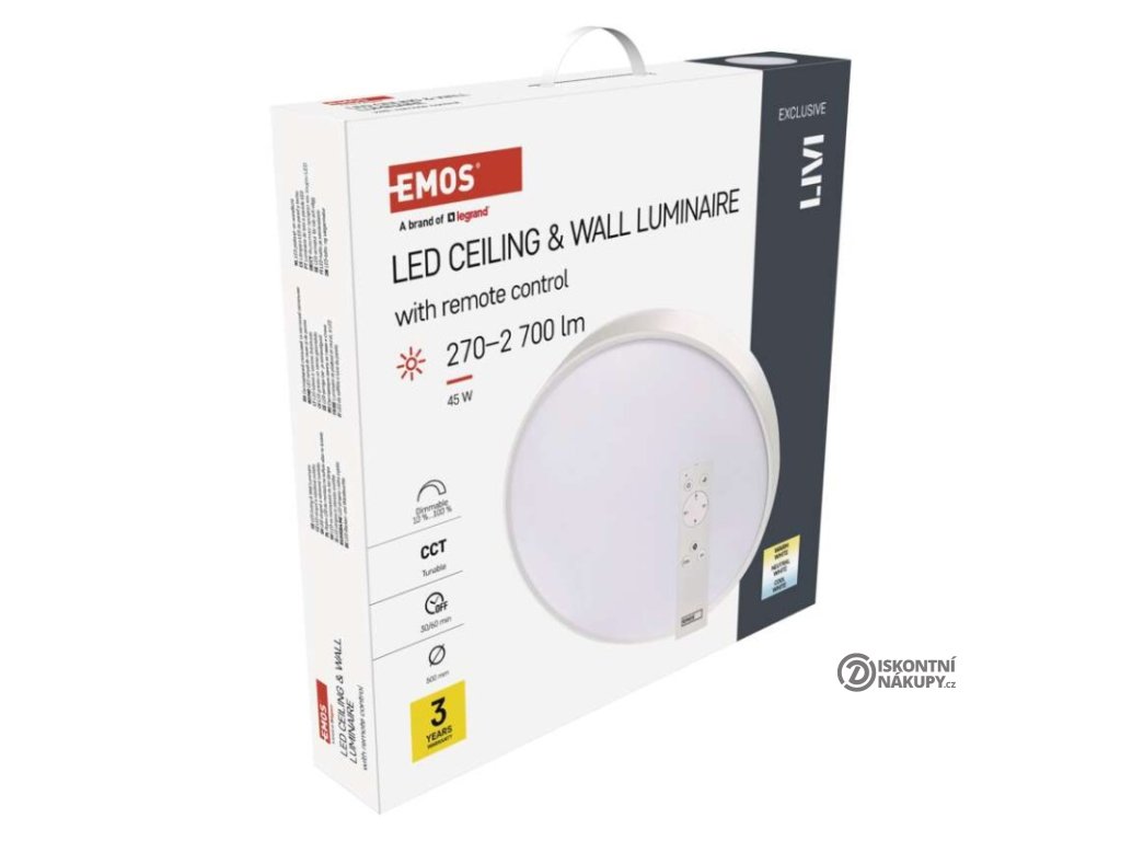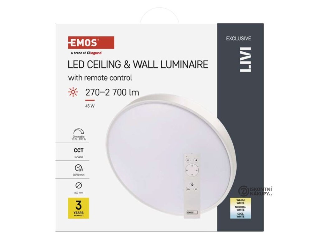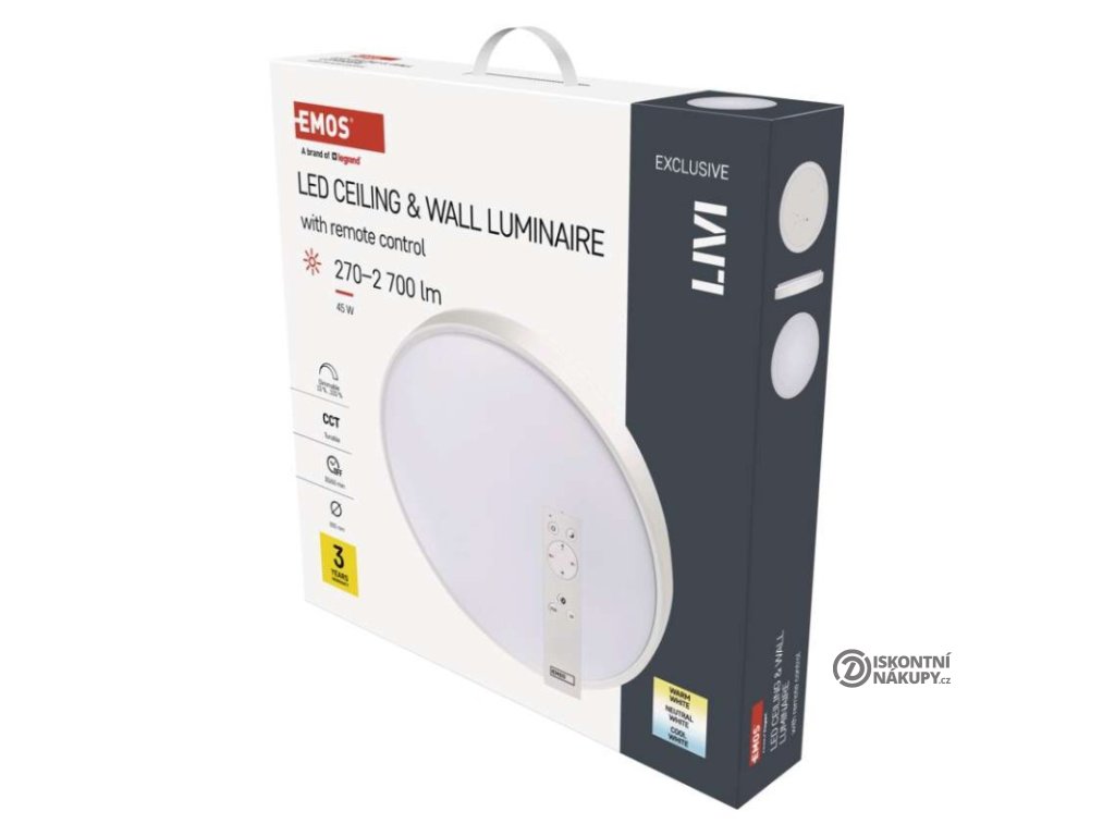 barva světla: teplá bílá–studená bílá|barva těla: bílá|dálkový ovladač: ano (2× AAA, R03)|do chodby a na schodiště: ano|do dílny a garáže: ne|do kanceláře: ano|do koupelny: ne|do kuchyně: ano|do obýváku, ložnice a dětského pokoje: ano|dosah senzoru: nemá senzor|flicker-free: ano|frekvence: 50/60 Hz|index podání barev (CRI): Ra > 80|kategorie: EXCLUSIVE|krytí: IP20|materiál difuzoru: plast (PMMA)|materiál LGP: neuvádí se|materiál těla: ocelový plech|montážní otvor: neuvádí se|možnost stmívání: ano|náhrada za žárovku: 160 W|napětí: 220–240 V|na zahradu a balkon: ne|pohybový senzor: neuvádí se|příkon: 45 W|prodejní obal: 1 ks, krabice|proud: 460 mA|řada: LIVI|rozměr: průměr 500 × 90 mm|světelná účinnost: 60 lm/W|světelný tok: 2 700 lm|teplota chromatičnosti: 2 700–6 500 K|tvar: kruh|typ difuzoru: mléčný|typ svítidla: klasické svítidlo|účiník: > 0,9|UGR<: neuvádí se|úhel vyzařování: 115°|umístění: stropní/nástěnné|výstupní proud ze zdroje: 175 mA|záruční doba: 3 roky|zdroj světla: LED|životnost: 30 000 hodin|způsob montáže: přisazenéDoplňkové parametry