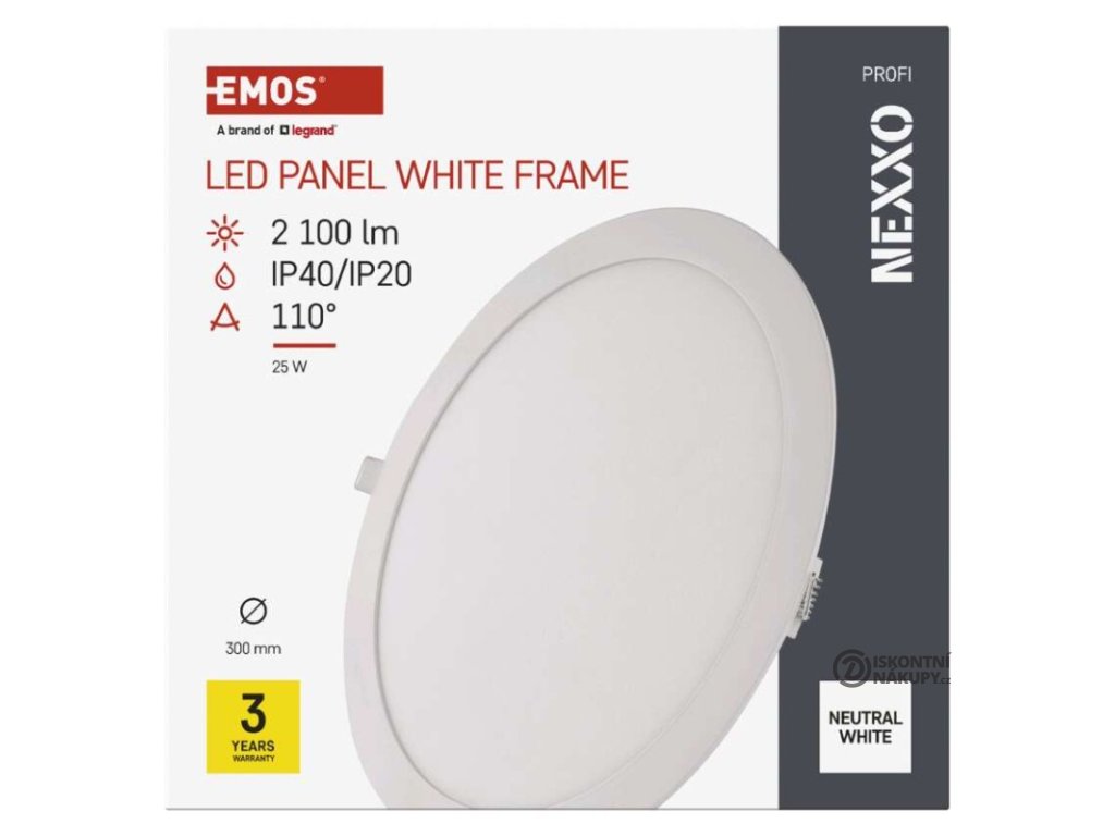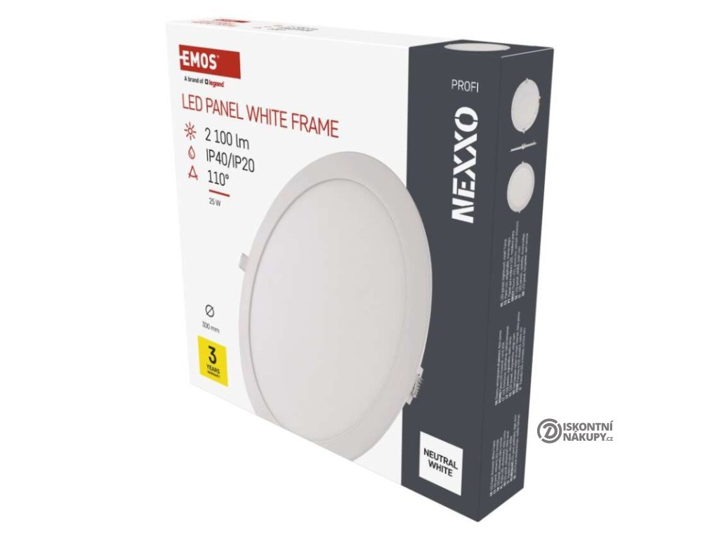 barva světla: neutrální bílá|barva těla: bílá|dálkový ovladač: ne|do chodby a na schodiště: ano|do dílny a garáže: ne|do kanceláře: ano|do koupelny: ne|do kuchyně: ano|do obýváku, ložnice a dětského pokoje: ano|dosah senzoru: nemá senzor|flicker-free: ano|frekvence: 50/60 Hz|index podání barev (CRI): Ra > 82|kategorie: PROFI|krytí: IP40/IP20|materiál difuzoru: plast (PS)|materiál LGP: PMMA|materiál těla: hliník|montážní otvor: 280 mm|možnost stmívání: ne|náhrada za žárovku: 125 W|napětí: 220–240 V|na zahradu a balkon: ne|pohybový senzor: ne|příkon: 25 W|prodejní obal: 1 ks, krabice|proud: 111 mA|řada: NEXXO|rozměr: průměr 300 × 21 mm|světelná účinnost: 83 lm/W|světelný tok: 2 100 lm|teplota chromatičnosti: 4 000 K|tvar: kruh|typ difuzoru: mléčný|typ svítidla: klasické svítidlo|účiník: > 0,9|UGR<: neuvádí se|úhel vyzařování: 110°|umístění: stropní|výstupní proud ze zdroje: 300 mA|záruční doba: 3 roky|zdroj světla: LED|životnost: 30 000 hodin|způsob montáže: vestavnéVýhody produktu