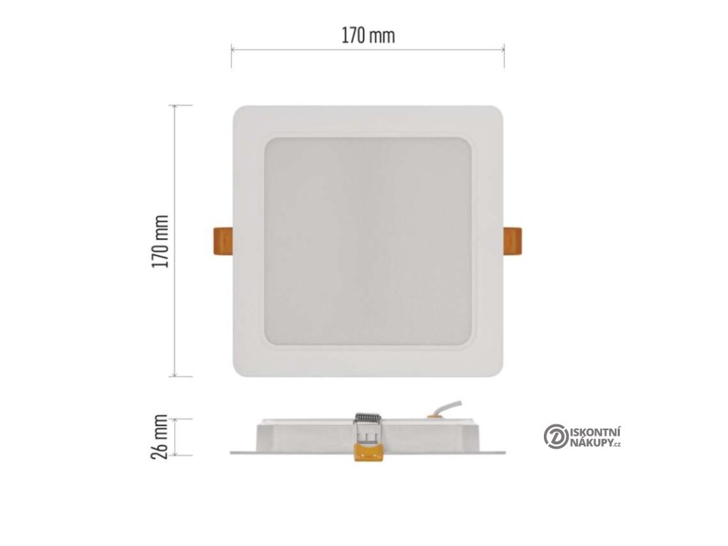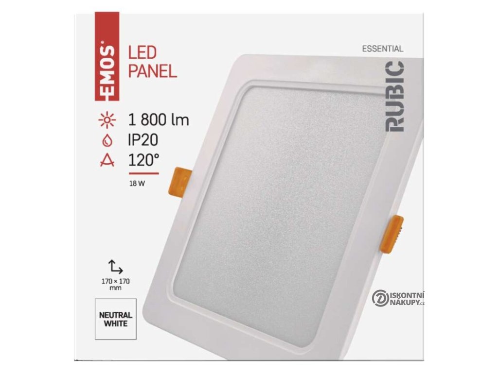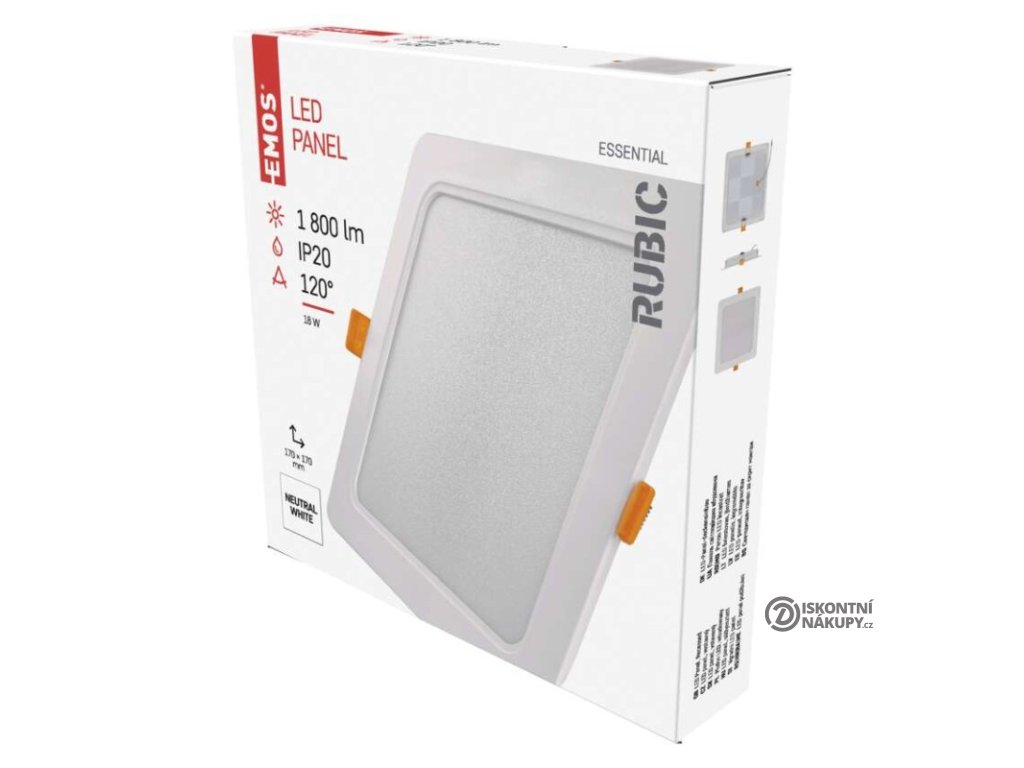 barva světla: neutrální bílá|barva těla: bílá|dálkový ovladač: ne|do chodby a na schodiště: ano|do dílny a garáže: ne|do kanceláře: ne|do koupelny: ne|do kuchyně: ano|do obýváku, ložnice a dětského pokoje: ne|dosah senzoru: nemá senzor|flicker-free: ano|frekvence: 50/60 Hz|index podání barev (CRI): Ra > 80|kategorie: ESSENTIAL|krytí: IP20|materiál difuzoru: plast (PC)|materiál LGP: neuvádí se|materiál těla: plast (PC)|montážní otvor: 140–160 mm|možnost stmívání: ne|náhrada za žárovku: 110 W|napětí: 220–240 V|na zahradu a balkon: ne|pohybový senzor: ne|příkon: 18 W|prodejní obal: 1 ks, krabice|proud: 157 mA|řada: RUBIC|rozměr: 170 × 170 × 26 mm|světelná účinnost: 100 lm/W|světelný tok: 1 800 lm|teplota chromatičnosti: 4 000 K|tvar: čtverec|typ difuzoru: mléčný|typ svítidla: klasické svítidlo|účiník: > 0,7|UGR<: neuvádí se|úhel vyzařování: 120°|umístění: stropní|výstupní proud ze zdroje: 50 mA|záruční doba: 2 roky|zdroj světla: LED|životnost: 25 000 hodin|způsob montáže: vestavnéVýhody produktu