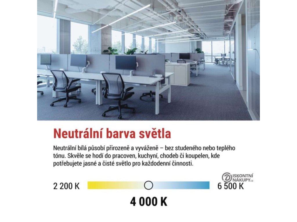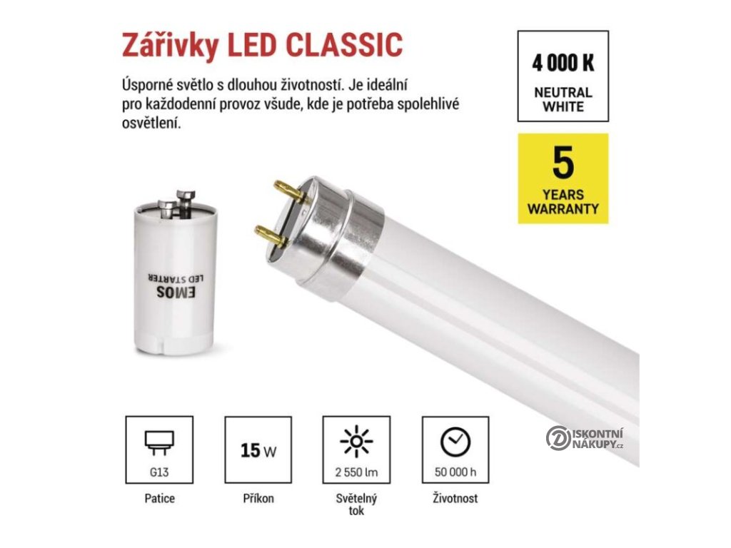 barva světla: neutrální bílá|energetická třída: C|index podání barev (CRI): 80|kompatibilita: –|náhrada za žárovku: –|napětí: 230 V~/50 Hz|notifikace do mobilní aplikace: –|ovládání hlasovými asistenty: –|patice (uchycení žárovky): G13|počet čipů: –|počet spínacích cyklů: 200 000|podporované OS: –|přenosová frekvence: –|příkon: 15 W|prodejní obal: 10 ks, krabička|protokol: –|řada: PROFI PLUS|rozměr: 1 213 × 27 × 27 mm|stmívatelná: ne|světelná účinnost: 170 lm/W|světelný tok: 2 550 lm|technologie: LED|teplota chromatičnosti: 4 000 K|tvar: T8|typ čipů: SMD|účiník: 0,90|úhel vyzařování: 250°|záruční doba: 5 let|životnost: 50 000 hodinDoplňkové parametry