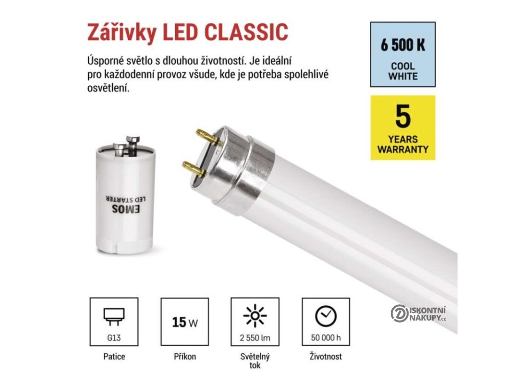 barva světla: studená bílá|energetická třída: C|index podání barev (CRI): 80|kompatibilita: –|náhrada za žárovku: –|napětí: 230 V~/50 Hz|notifikace do mobilní aplikace: –|ovládání hlasovými asistenty: –|patice (uchycení žárovky): G13|počet čipů: –|počet spínacích cyklů: 200 000|podporované OS: –|přenosová frekvence: –|příkon: 15 W|prodejní obal: 10 ks, krabička|protokol: –|řada: PROFI PLUS|rozměr: 1 213 × 27 × 27 mm|stmívatelná: ne|světelná účinnost: 170 lm/W|světelný tok: 2 550 lm|technologie: LED|teplota chromatičnosti: 6 500 K|tvar: T8|typ čipů: SMD|účiník: 0,90|úhel vyzařování: 250°|záruční doba: 5 let|životnost: 50 000 hodinDoplňkové parametry