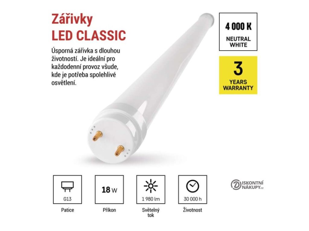 barva světla: neutrální bílá|energetická třída: E|index podání barev (CRI): 80|kompatibilita: –|náhrada za žárovku: neuvádí se|napětí: 230 V~/50 Hz|notifikace do mobilní aplikace: –|ovládání hlasovými asistenty: –|patice (uchycení žárovky): G13|počet čipů: neuvádí se|počet spínacích cyklů: 20 000|podporované OS: –|přenosová frekvence: –|příkon: 18 W|prodejní obal: 25 ks, krabička|protokol: –|řada: CLASSIC|rozměr: 1 200 × 26 × 26 mm|stmívatelná: ne|světelná účinnost: 110 lm/W|světelný tok: 1 980 lm|technologie: LED|teplota chromatičnosti: 4 000 K|tvar: T8|typ čipů: SMD|účiník: 0,5|úhel vyzařování: 260°|záruční doba: 3 roky|životnost: 30 000 hodinDoplňkové parametry
