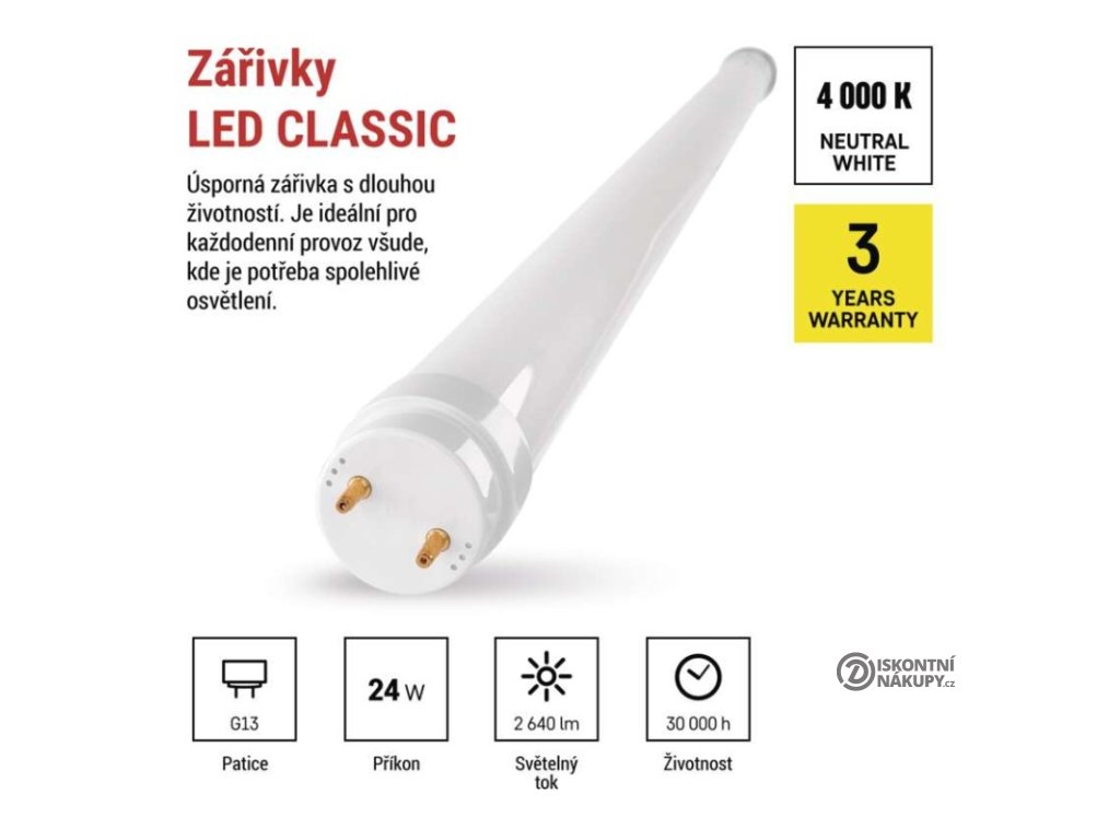 barva světla: neutrální bílá|energetická třída: E|index podání barev (CRI): 80|kompatibilita: –|náhrada za žárovku: neuvádí se|napětí: 230 V~/50 Hz|notifikace do mobilní aplikace: –|ovládání hlasovými asistenty: –|patice (uchycení žárovky): G13|počet čipů: neuvádí se|počet spínacích cyklů: 20 000|podporované OS: –|přenosová frekvence: –|příkon: 24 W|prodejní obal: 25 ks, krabička|protokol: –|řada: CLASSIC|rozměr: 1 500 × 26 × 26 mm|stmívatelná: ne|světelná účinnost: 110 lm/W|světelný tok: 2 640 lm|technologie: LED|teplota chromatičnosti: 4 000 K|tvar: T8|typ čipů: SMD|účiník: 0,5|úhel vyzařování: 260°|záruční doba: 3 roky|životnost: 30 000 hodinDoplňkové parametry