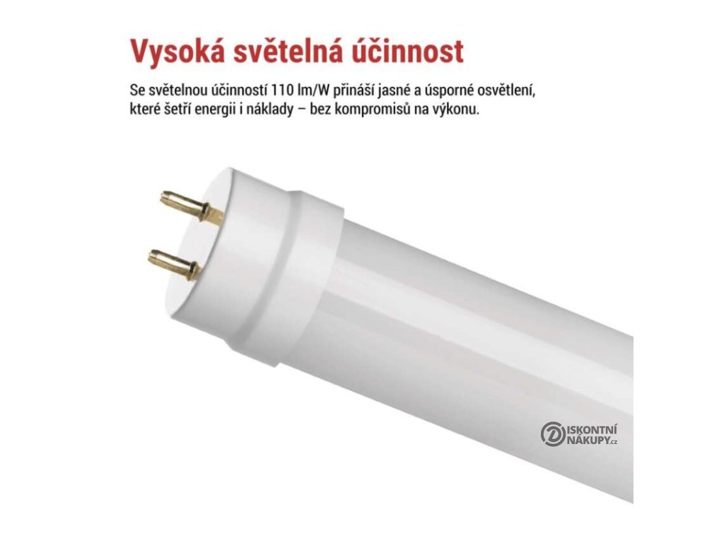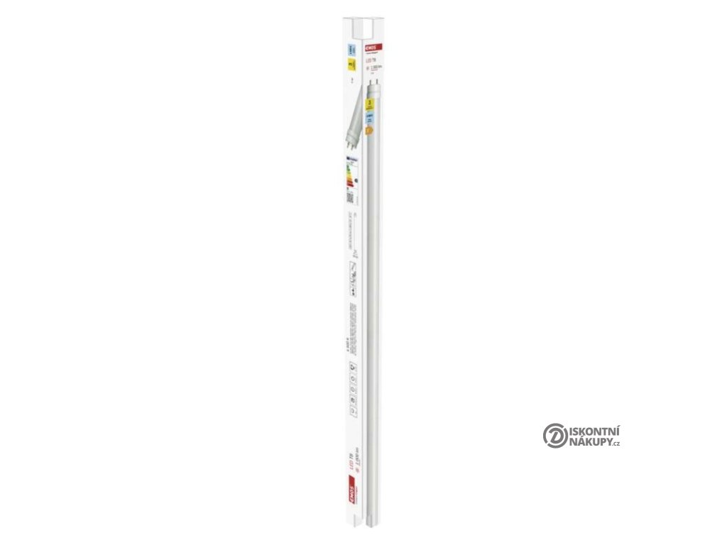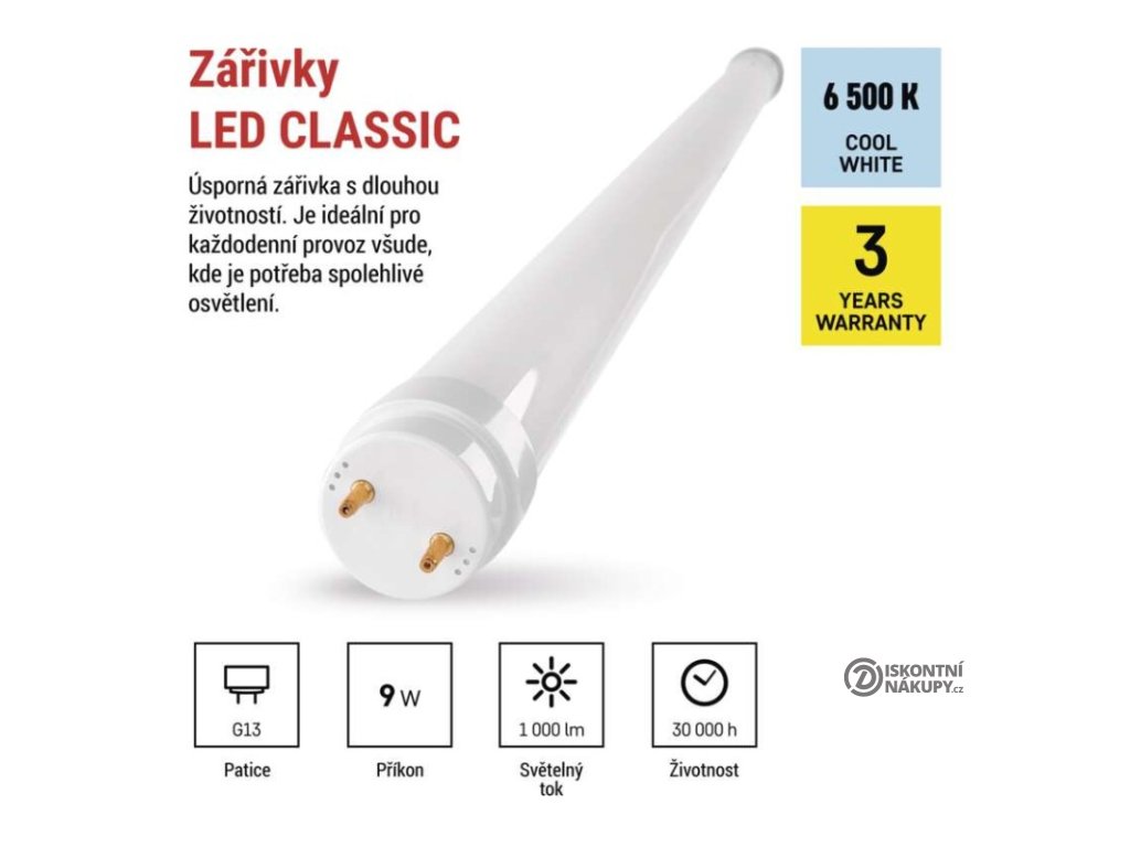 barva světla: studená bílá|energetická třída: E|index podání barev (CRI): 80|kompatibilita: –|náhrada za žárovku: neuvádí se|napětí: 230 V~/50 Hz|notifikace do mobilní aplikace: –|ovládání hlasovými asistenty: –|patice (uchycení žárovky): G13|počet čipů: neuvádí se|počet spínacích cyklů: 20 000|podporované OS: –|přenosová frekvence: –|příkon: 9 W|prodejní obal: 25 ks, krabička|protokol: –|řada: CLASSIC|rozměr: 600 × 26 × 26 mm|stmívatelná: ne|světelná účinnost: 111 lm/W|světelný tok: 1 000 lm|technologie: LED|teplota chromatičnosti: 6 500 K|tvar: T8|typ čipů: SMD|účiník: 0,5|úhel vyzařování: 260°|záruční doba: 3 roky|životnost: 30 000 hodinDoplňkové parametry
