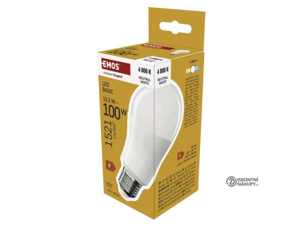 barva světla: neutrální bílá|energetická třída: F|index podání barev (CRI): 80|kompatibilita: –|náhrada za žárovku: 100 W|napětí: 230 V~/50 Hz|notifikace do mobilní aplikace: ne|ovládání hlasovými asistenty: ne|patice (uchycení žárovky): E27|počet čipů: neuvádí se|počet spínacích cyklů: 20 000|podporované OS: –|přenosová frekvence: –|příkon: 15,3 W|prodejní obal: 1 ks, krabička|protokol: –|řada: BASIC|rozměr: 60 × 60 × 125 (max.) mm|stmívatelná: ne|světelná účinnost: 99 lm/W|světelný tok: 1 521 lm|technologie: LED|teplota chromatičnosti: 4 000 K|tvar: A60|typ čipů: SMD|účiník: 0,50|úhel vyzařování: 200°|záruční doba: 2 roky|životnost: 20 000 hodinDoplňkové parametry