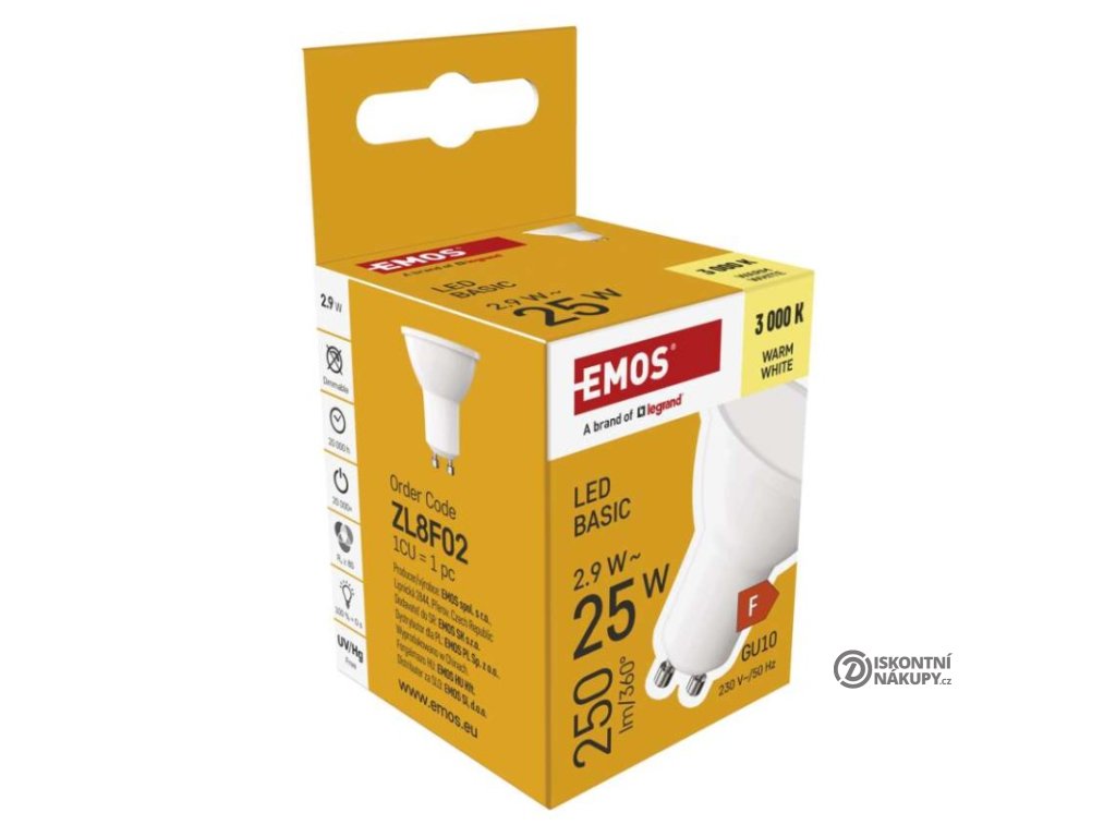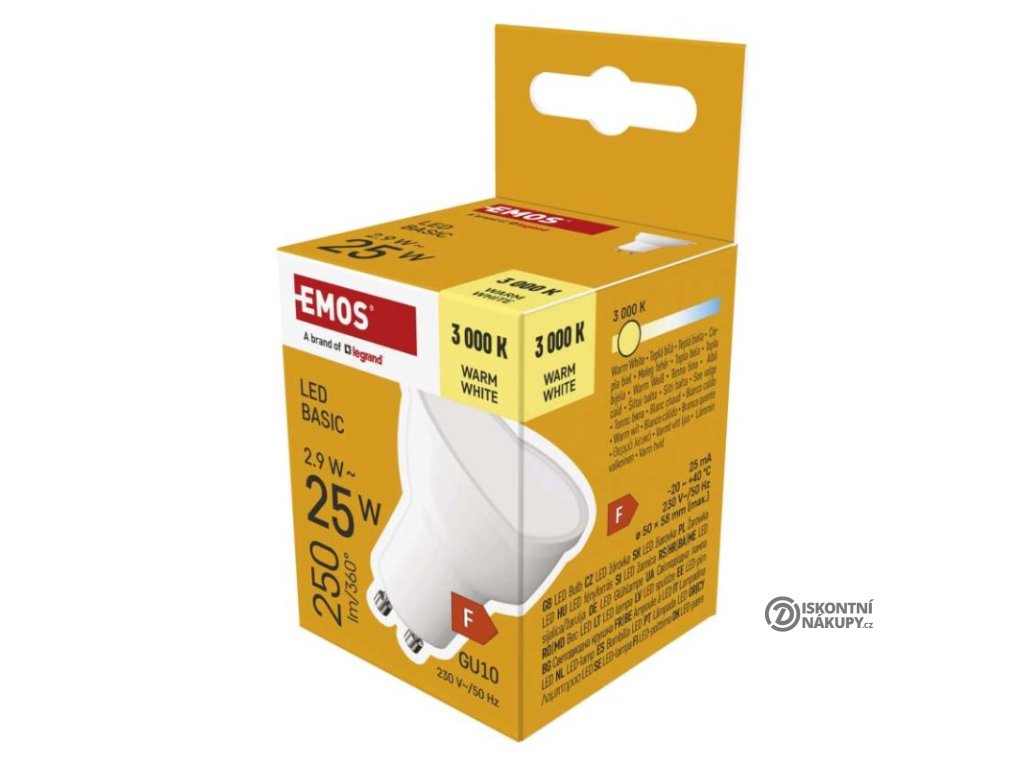 barva světla: teplá bílá|energetická třída: F|index podání barev (CRI): 80|kompatibilita: –|náhrada za žárovku: 25 W|napětí: 230 V~/50 Hz|notifikace do mobilní aplikace: ne|ovládání hlasovými asistenty: ne|patice (uchycení žárovky): GU10|počet čipů: neuvádí se|počet spínacích cyklů: 20 000|podporované OS: –|přenosová frekvence: –|příkon: 2,9 W|prodejní obal: 1 ks, krabička|protokol: –|řada: BASIC|rozměr: 50 × 50 × 58 (max.) mm|stmívatelná: ne|světelná účinnost: 86 lm/W|světelný tok: 250 lm|technologie: LED|teplota chromatičnosti: 3 000 K|tvar: MR16|typ čipů: SMD|účiník: 0,50|úhel vyzařování: 110°|záruční doba: 2 roky|životnost: 20 000 hodinDoplňkové parametry