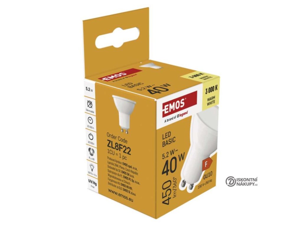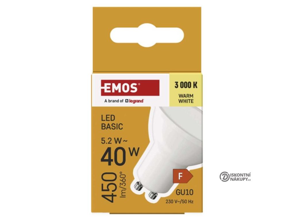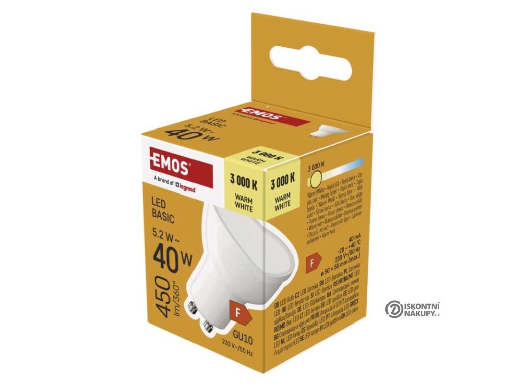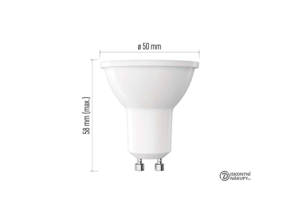 barva světla: teplá bílá|energetická třída: F|index podání barev (CRI): 80|kompatibilita: –|náhrada za žárovku: 40 W|napětí: 230 V~/50 Hz|notifikace do mobilní aplikace: ne|ovládání hlasovými asistenty: ne|patice (uchycení žárovky): GU10|počet čipů: neuvádí se|počet spínacích cyklů: 20 000|podporované OS: –|přenosová frekvence: –|příkon: 5,2 W|prodejní obal: 1 ks, krabička|protokol: –|řada: BASIC|rozměr: 50 × 50 × 58 (max.) mm|stmívatelná: ne|světelná účinnost: 87 lm/W|světelný tok: 450 lm|technologie: LED|teplota chromatičnosti: 3 000 K|tvar: MR16|typ čipů: SMD|účiník: 0,50|úhel vyzařování: 110°|záruční doba: 2 roky|životnost: 20 000 hodinDoplňkové parametry