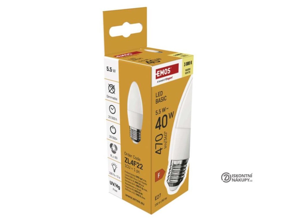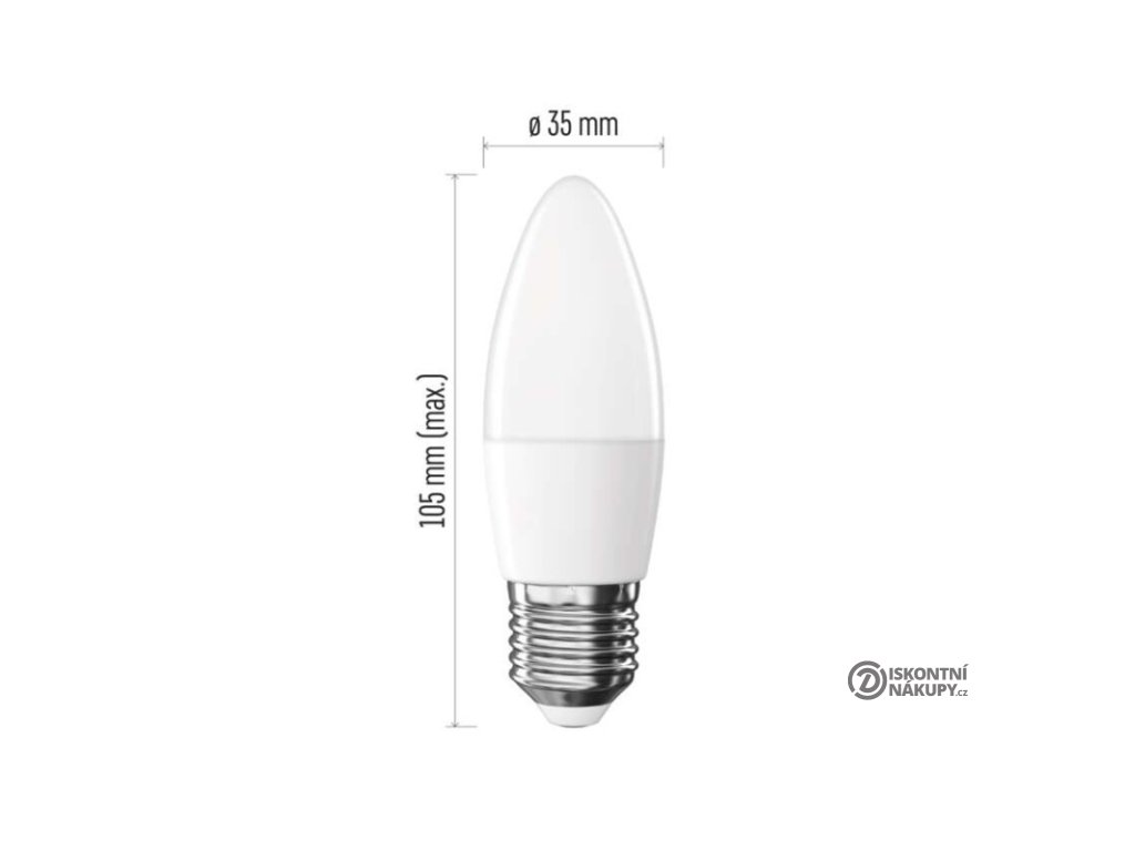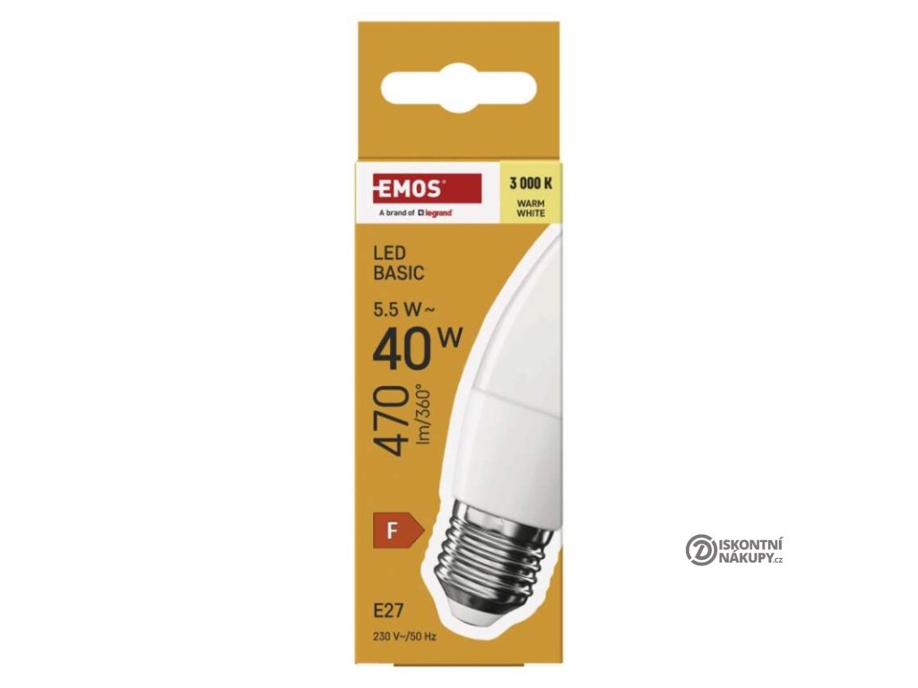 barva světla: teplá bílá|energetická třída: F|index podání barev (CRI): 80|kompatibilita: –|náhrada za žárovku: 40 W|napětí: 230 V~/50 Hz|notifikace do mobilní aplikace: ne|ovládání hlasovými asistenty: ne|patice (uchycení žárovky): E27|počet čipů: neuvádí se|počet spínacích cyklů: 20 000|podporované OS: –|přenosová frekvence: –|příkon: 5,5 W|prodejní obal: 1 ks, krabička|protokol: –|řada: BASIC|rozměr: 35 × 35 × 105 (max.) mm|stmívatelná: ne|světelná účinnost: 85 lm/W|světelný tok: 470 lm|technologie: LED|teplota chromatičnosti: 3 000 K|tvar: svíčka|typ čipů: SMD|účiník: 0,50|úhel vyzařování: 180°|záruční doba: 2 roky|životnost: 20 000 hodinDoplňkové parametry