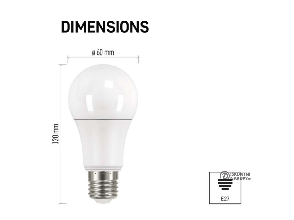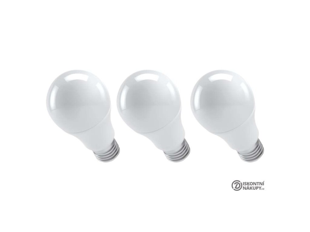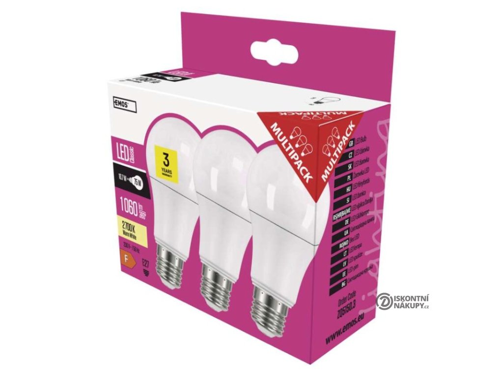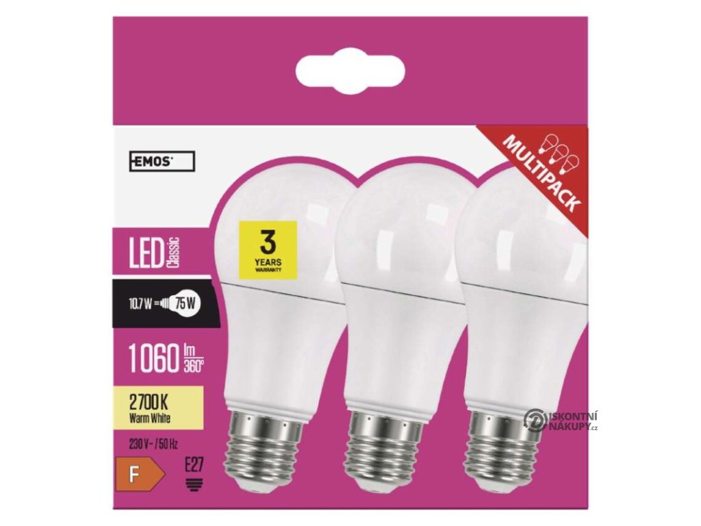 barva světla: teplá bílá|energetická třída: F|index podání barev (CRI): 83|kompatibilita: –|náhrada za žárovku: 75 W|napětí: 230 V~/50 Hz|notifikace do mobilní aplikace: –|ovládání hlasovými asistenty: –|patice (uchycení žárovky): E27|počet čipů: neuvádí se|počet spínacích cyklů: 25 000|podporované OS: –|přenosová frekvence: –|příkon: 10,7 W|prodejní obal: 3 ks, krabička|protokol: –|řada: CLASSIC|rozměr: 120 × 60 × 60 mm|stmívatelná: ne|světelná účinnost: 99 lm/W|světelný tok: 1 060 lm|technologie: LED|teplota chromatičnosti: 2 700 K|tvar: A60|typ čipů: SMD|účiník: 0,56|úhel vyzařování: 180°|záruční doba: 3 roky|životnost: 30 000 hodinDoplňkové parametry