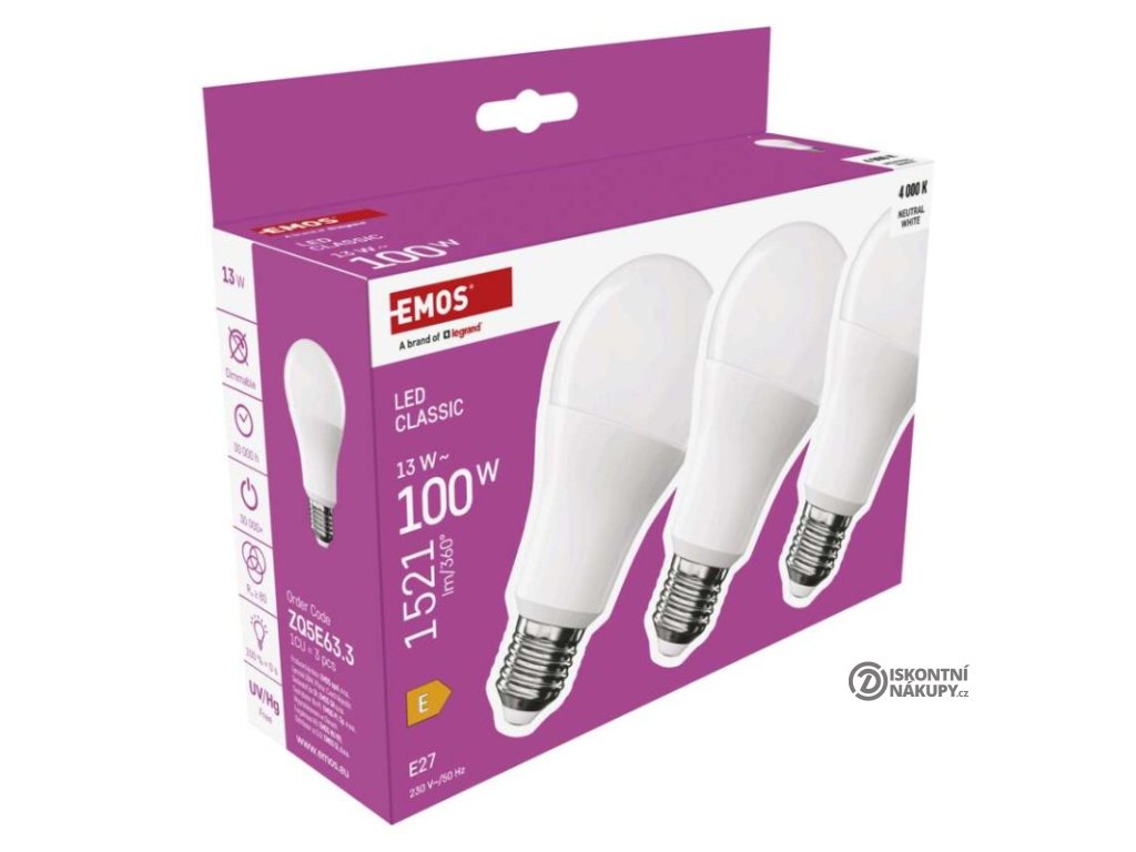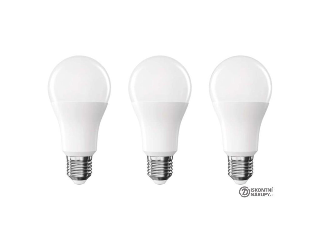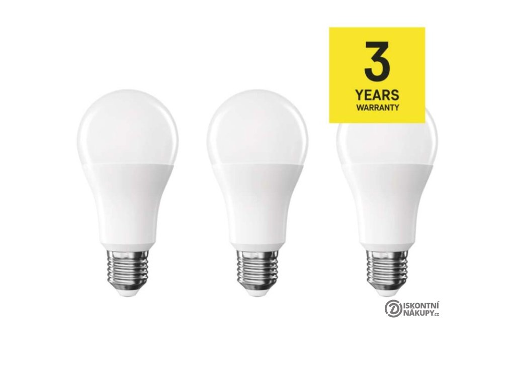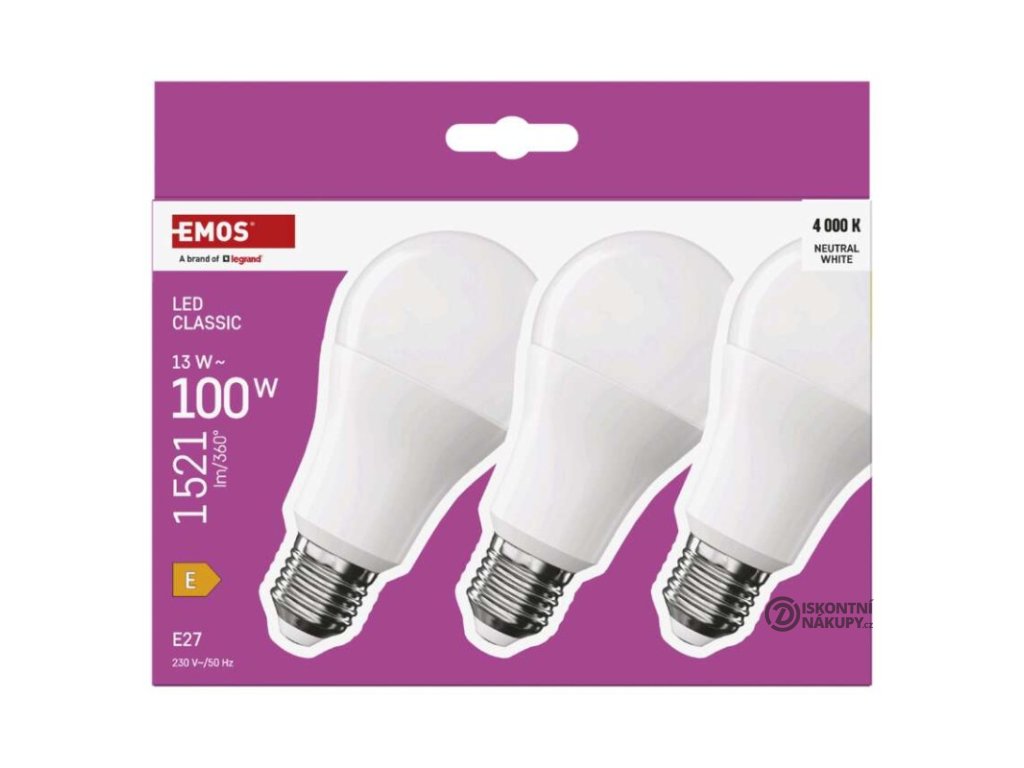 barva světla: neutrální bílá|energetická třída: E|index podání barev (CRI): 80|kompatibilita: –|náhrada za žárovku: 100 W|napětí: 230 V~/50 Hz|notifikace do mobilní aplikace: ne|ovládání hlasovými asistenty: ne|patice (uchycení žárovky): E27|počet čipů: neuvádí se|počet spínacích cyklů: 30 000|podporované OS: –|přenosová frekvence: –|příkon: 13 W|prodejní obal: 3 ks, krabička|protokol: –|řada: CLASSIC|rozměr: 60 × 60 × 120 mm|stmívatelná: ne|světelná účinnost: 117 lm/W|světelný tok: 1 521 lm|technologie: LED|teplota chromatičnosti: 4 000 K|tvar: A60|typ čipů: SMD|účiník: 0,50|úhel vyzařování: 180°|záruční doba: 3 roky|životnost: 30 000 hodinDoplňkové parametry