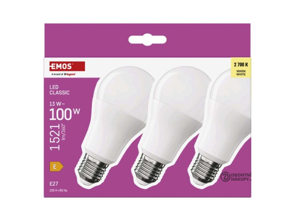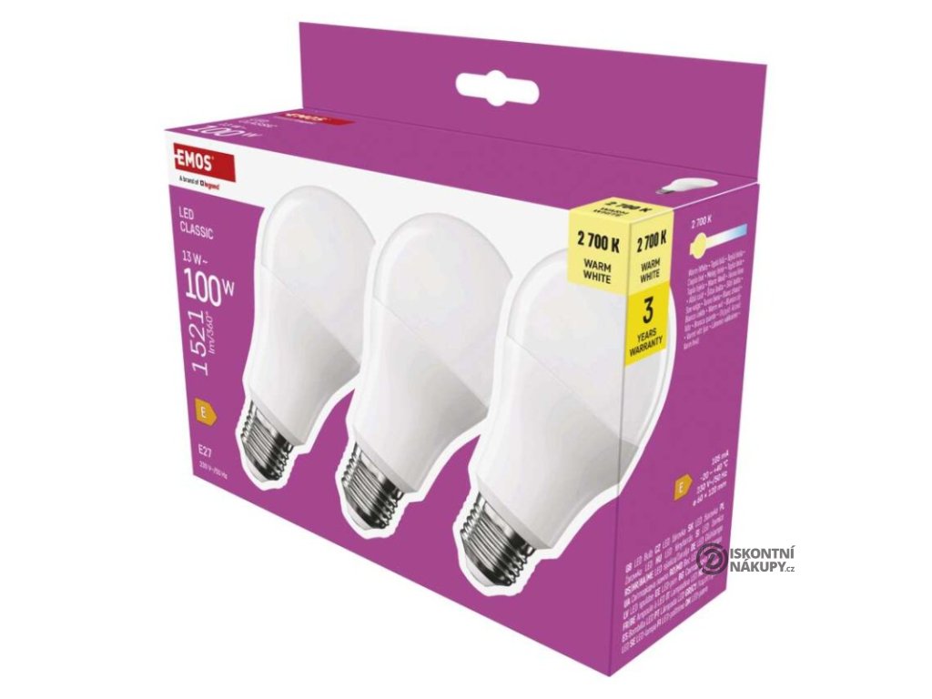 barva světla: teplá bílá|energetická třída: E|index podání barev (CRI): 80|kompatibilita: –|náhrada za žárovku: 100 W|napětí: 230 V~/50 Hz|notifikace do mobilní aplikace: ne|ovládání hlasovými asistenty: ne|patice (uchycení žárovky): E27|počet čipů: neuvádí se|počet spínacích cyklů: 30 000|podporované OS: –|přenosová frekvence: –|příkon: 13 W|prodejní obal: 3 ks, krabička|protokol: –|řada: CLASSIC|rozměr: 60 × 60 × 120 mm|stmívatelná: ne|světelná účinnost: 117 lm/W|světelný tok: 1 521 lm|technologie: LED|teplota chromatičnosti: 2 700 K|tvar: A60|typ čipů: SMD|účiník: 0,50|úhel vyzařování: 180°|záruční doba: 3 roky|životnost: 30 000 hodinDoplňkové parametry