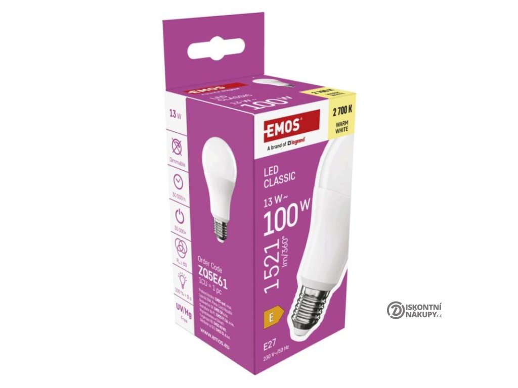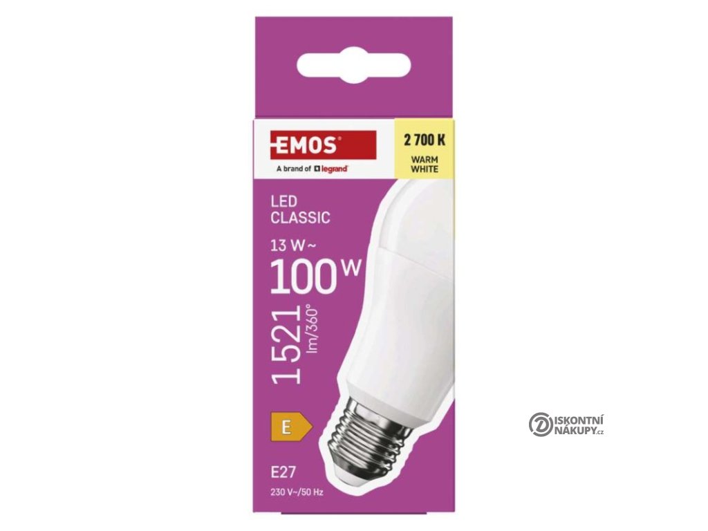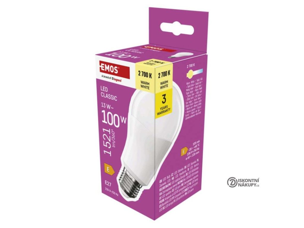 barva světla: teplá bílá|energetická třída: E|index podání barev (CRI): 80|kompatibilita: –|náhrada za žárovku: 100 W|napětí: 230 V~/50 Hz|notifikace do mobilní aplikace: ne|ovládání hlasovými asistenty: ne|patice (uchycení žárovky): E27|počet čipů: neuvádí se|počet spínacích cyklů: 30 000|podporované OS: –|přenosová frekvence: –|příkon: 13 W|prodejní obal: 1 ks, krabička|protokol: –|řada: CLASSIC|rozměr: 60 × 60 × 120 mm|stmívatelná: ne|světelná účinnost: 117 lm/W|světelný tok: 1 521 lm|technologie: LED|teplota chromatičnosti: 2 700 K|tvar: A60|typ čipů: SMD|účiník: 0,50|úhel vyzařování: 180°|záruční doba: 3 roky|životnost: 30 000 hodinDoplňkové parametry