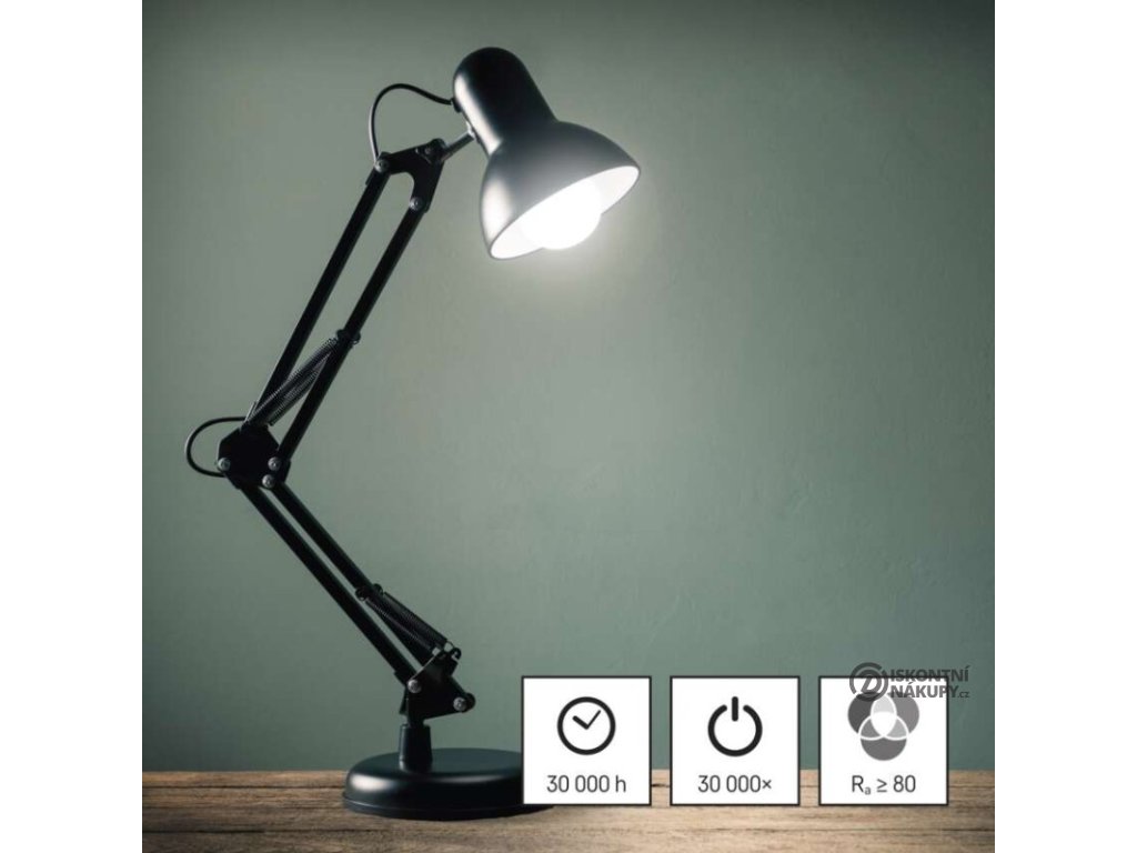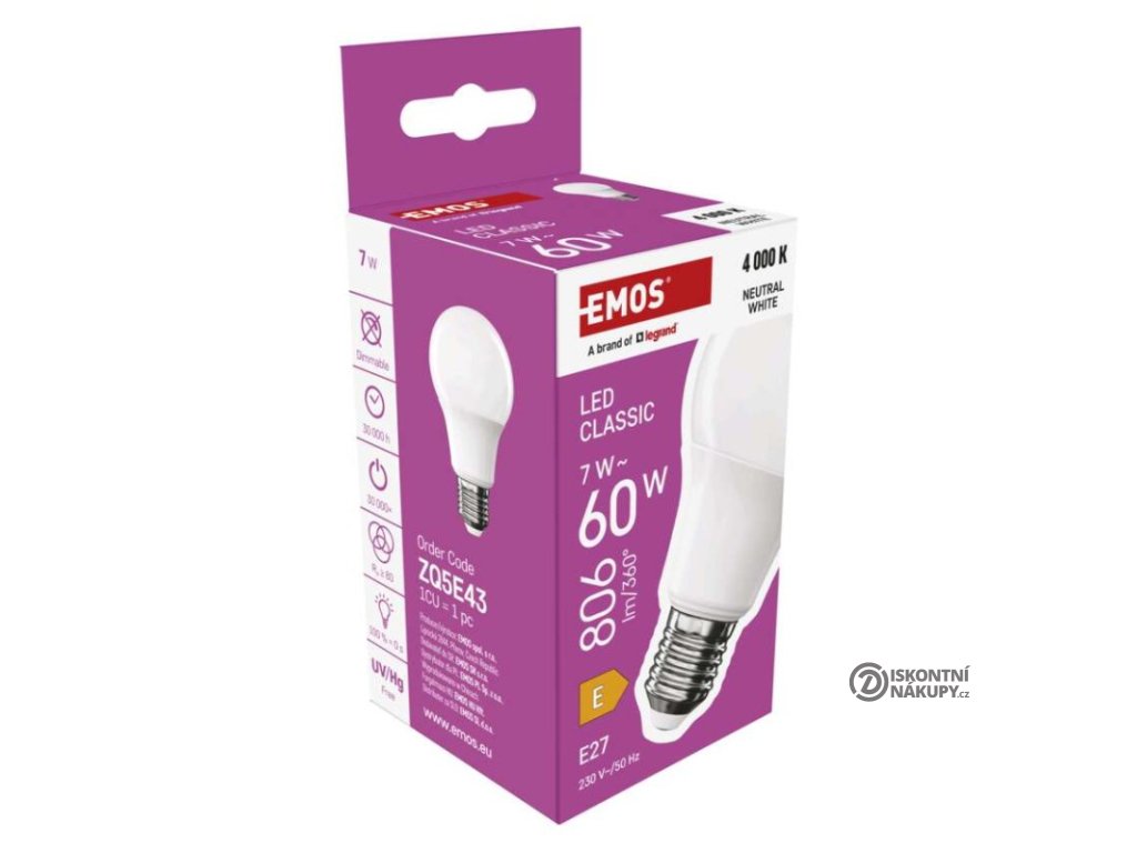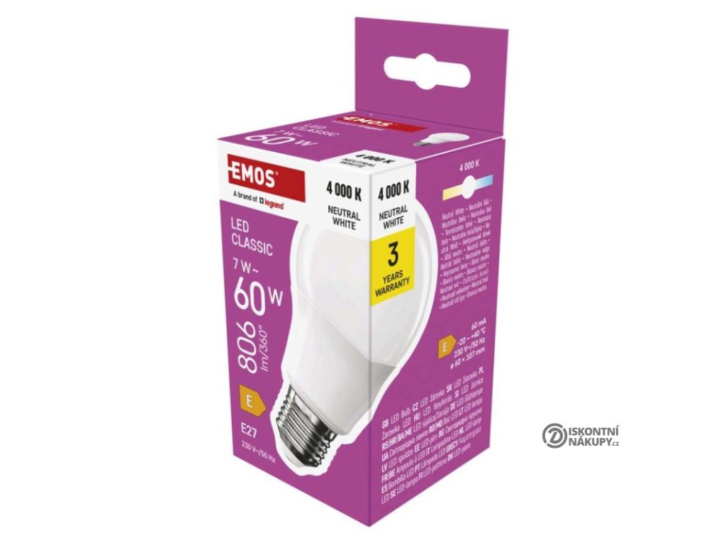 barva světla: neutrální bílá|energetická třída: E|index podání barev (CRI): 80|kompatibilita: –|náhrada za žárovku: 60 W|napětí: 230 V~/50 Hz|notifikace do mobilní aplikace: ne|ovládání hlasovými asistenty: ne|patice (uchycení žárovky): E27|počet čipů: neuvádí se|počet spínacích cyklů: 30 000|podporované OS: –|přenosová frekvence: –|příkon: 7 W|prodejní obal: 1 ks, krabička|protokol: –|řada: CLASSIC|rozměr: 60 × 60 × 107 mm|stmívatelná: ne|světelná účinnost: 115 lm/W|světelný tok: 806 lm|technologie: LED|teplota chromatičnosti: 4 000 K|tvar: A60|typ čipů: SMD|účiník: 0,50|úhel vyzařování: 180°|záruční doba: 3 roky|životnost: 30 000 hodinDoplňkové parametry