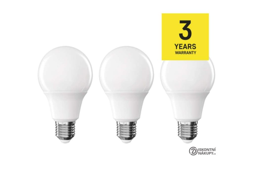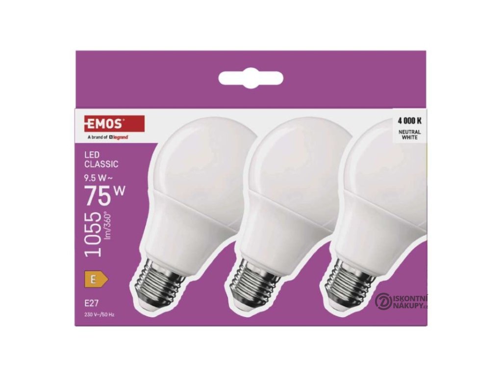 barva světla: neutrální bílá|energetická třída: E|index podání barev (CRI): 80|kompatibilita: –|náhrada za žárovku: 75 W|napětí: 230 V~/50 Hz|notifikace do mobilní aplikace: ne|ovládání hlasovými asistenty: ne|patice (uchycení žárovky): E27|počet čipů: neuvádí se|počet spínacích cyklů: 30 000|podporované OS: –|přenosová frekvence: –|příkon: 9,5 W|prodejní obal: 3 ks, krabička|protokol: –|řada: CLASSIC|rozměr: 60 × 60 × 109 mm|stmívatelná: ne|světelná účinnost: 111 lm/W|světelný tok: 1 055 lm|technologie: LED|teplota chromatičnosti: 4 000 K|tvar: A60|typ čipů: SMD|účiník: 0,50|úhel vyzařování: 180°|záruční doba: 3 roky|životnost: 30 000 hodinDoplňkové parametry