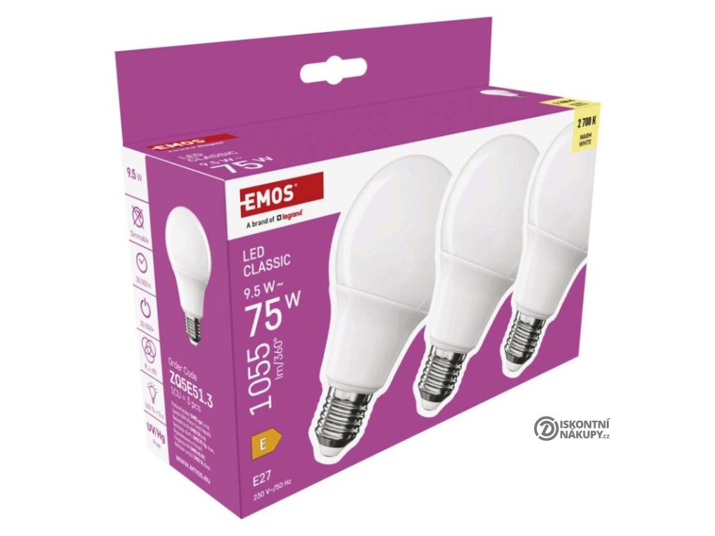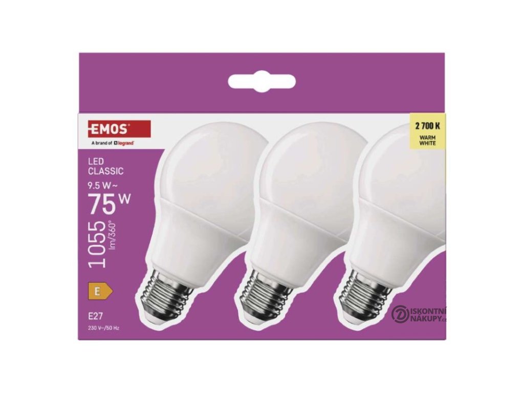 barva světla: teplá bílá|energetická třída: E|index podání barev (CRI): 80|kompatibilita: –|náhrada za žárovku: 75 W|napětí: 230 V~/50 Hz|notifikace do mobilní aplikace: ne|ovládání hlasovými asistenty: ne|patice (uchycení žárovky): E27|počet čipů: neuvádí se|počet spínacích cyklů: 30 000|podporované OS: –|přenosová frekvence: –|příkon: 9,5 W|prodejní obal: 3 ks, krabička|protokol: –|řada: CLASSIC|rozměr: 60 × 60 × 109 mm|stmívatelná: ne|světelná účinnost: 111 lm/W|světelný tok: 1 055 lm|technologie: LED|teplota chromatičnosti: 2 700 K|tvar: A60|typ čipů: SMD|účiník: 0,50|úhel vyzařování: 180°|záruční doba: 3 roky|životnost: 30 000 hodinDoplňkové parametry