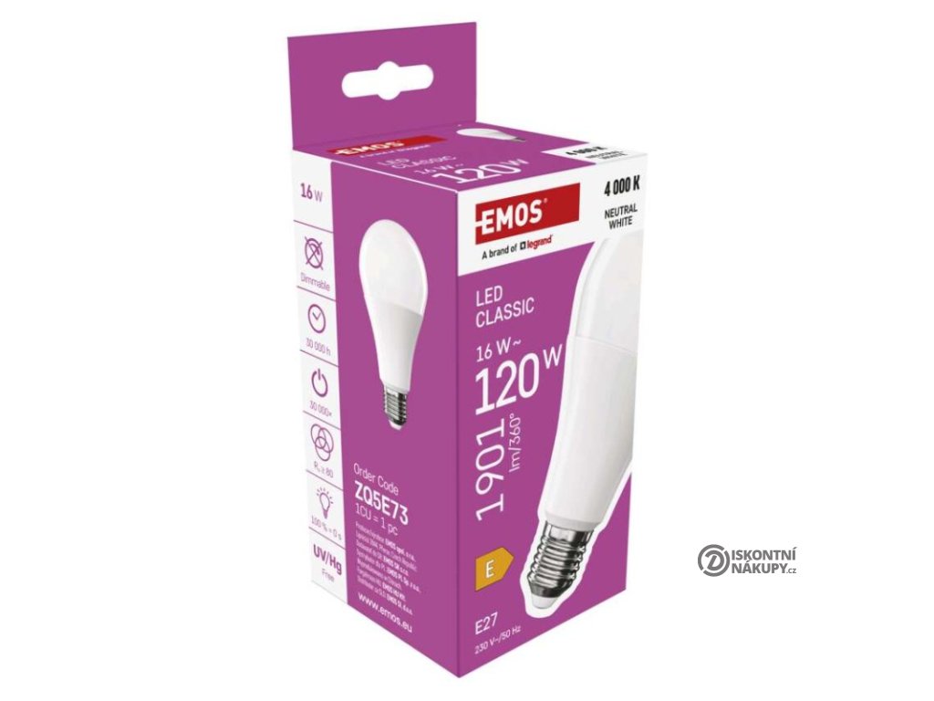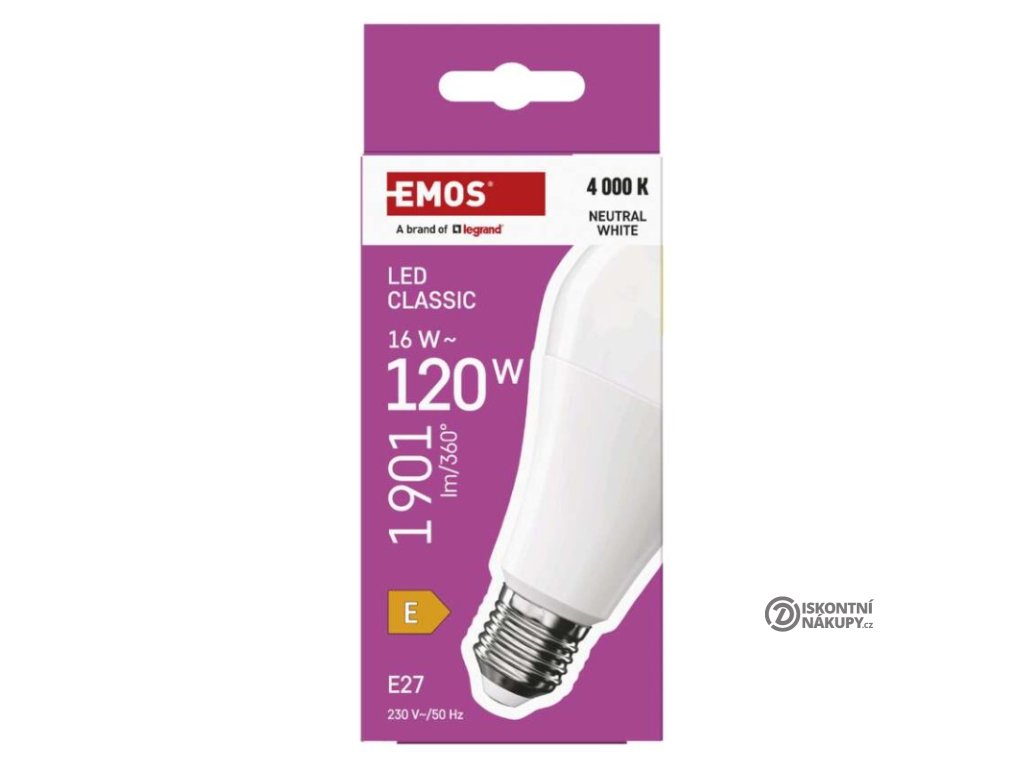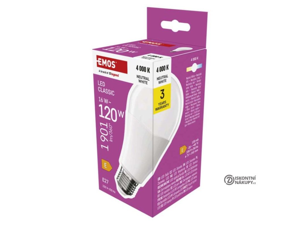 barva světla: neutrální bílá|energetická třída: E|index podání barev (CRI): 80|kompatibilita: –|náhrada za žárovku: 120 W|napětí: 230 V~/50 Hz|notifikace do mobilní aplikace: ne|ovládání hlasovými asistenty: ne|patice (uchycení žárovky): E27|počet čipů: neuvádí se|počet spínacích cyklů: 30 000|podporované OS: –|přenosová frekvence: –|příkon: 16 W|prodejní obal: 1 ks, krabička|protokol: –|řada: CLASSIC|rozměr: 71 × 71 × 142 mm|stmívatelná: ne|světelná účinnost: 119 lm/W|světelný tok: 1 901 lm|technologie: LED|teplota chromatičnosti: 4 000 K|tvar: A70|typ čipů: SMD|účiník: 0,50|úhel vyzařování: 180°|záruční doba: 3 roky|životnost: 30 000 hodinDoplňkové parametry