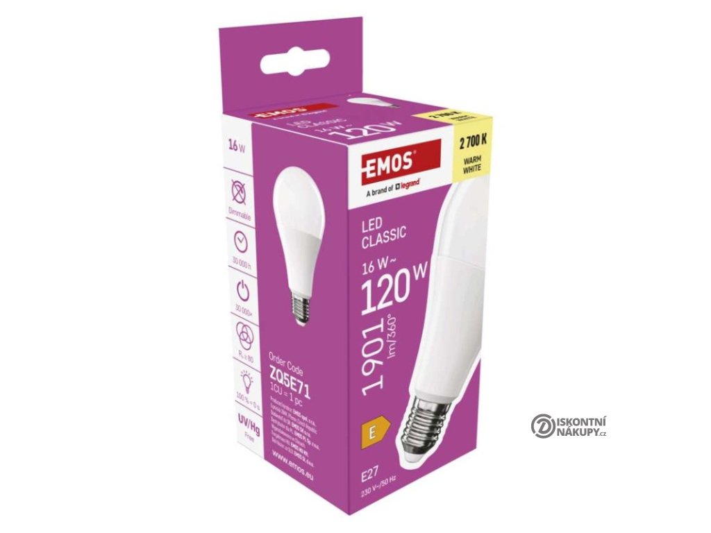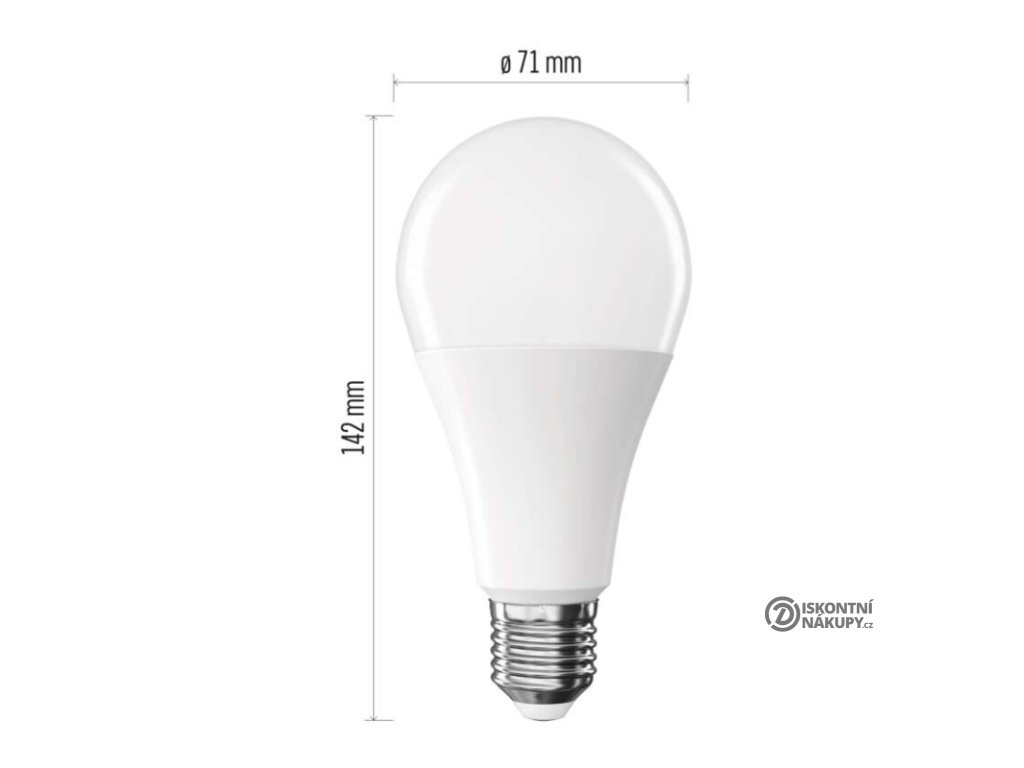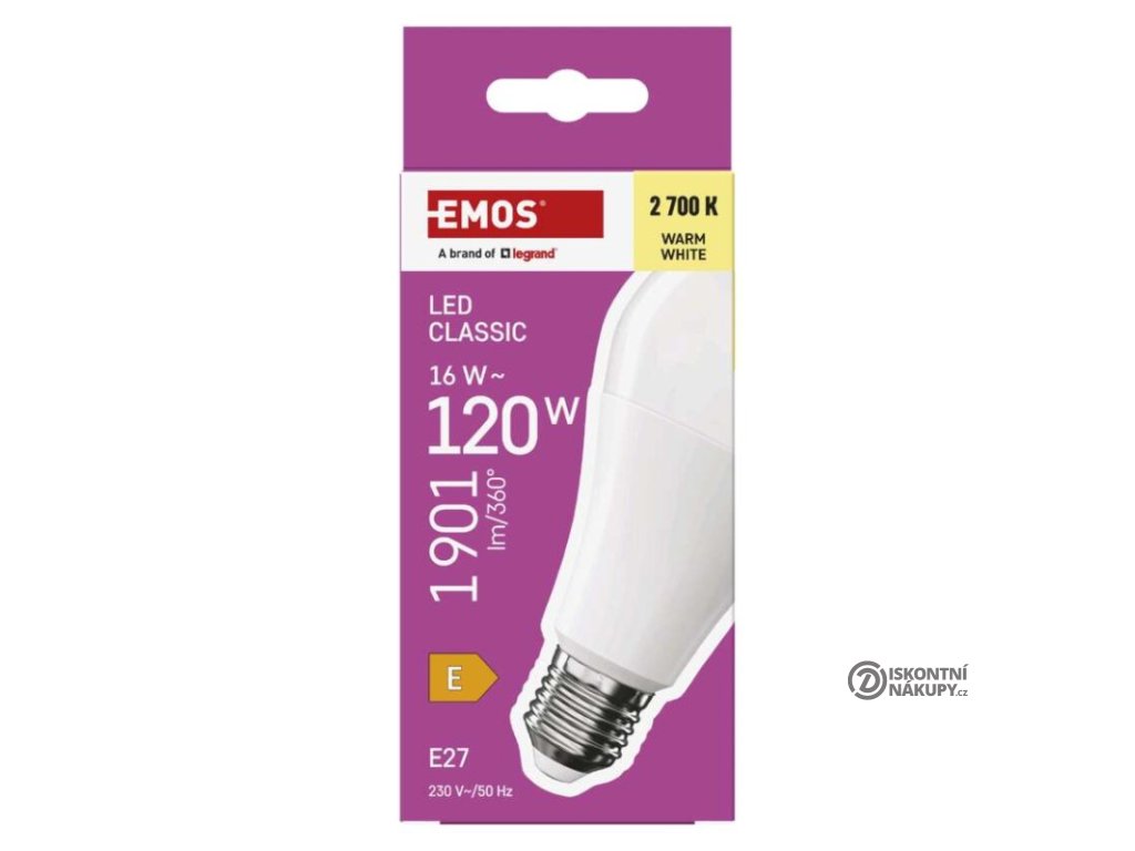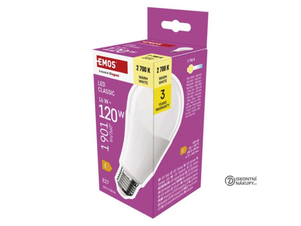 barva světla: teplá bílá|energetická třída: E|index podání barev (CRI): 80|kompatibilita: –|náhrada za žárovku: 120 W|napětí: 230 V~/50 Hz|notifikace do mobilní aplikace: ne|ovládání hlasovými asistenty: ne|patice (uchycení žárovky): E27|počet čipů: neuvádí se|počet spínacích cyklů: 30 000|podporované OS: –|přenosová frekvence: –|příkon: 16 W|prodejní obal: 1 ks, krabička|protokol: –|řada: CLASSIC|rozměr: 71 × 71 × 142 mm|stmívatelná: ne|světelná účinnost: 119 lm/W|světelný tok: 1 901 lm|technologie: LED|teplota chromatičnosti: 2 700 K|tvar: A70|typ čipů: SMD|účiník: 0,50|úhel vyzařování: 180°|záruční doba: 3 roky|životnost: 30 000 hodinDoplňkové parametry