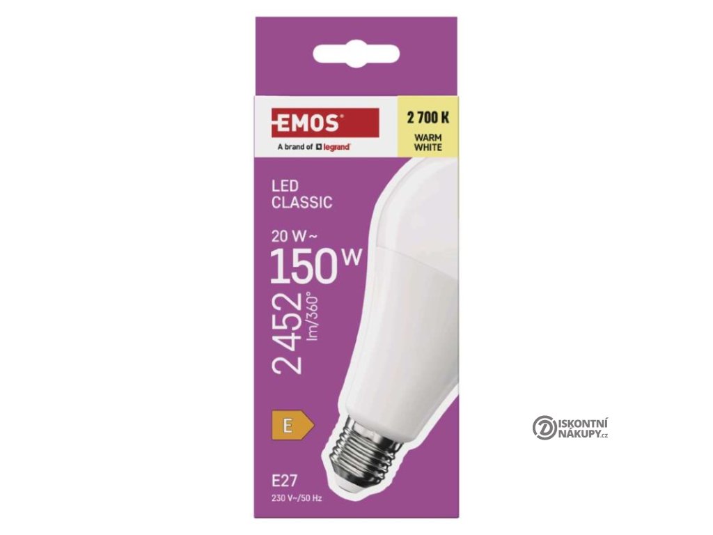 barva světla: teplá bílá|energetická třída: E|index podání barev (CRI): 80|kompatibilita: –|náhrada za žárovku: 150 W|napětí: 230 V~/50 Hz|notifikace do mobilní aplikace: ne|ovládání hlasovými asistenty: ne|patice (uchycení žárovky): E27|počet čipů: neuvádí se|počet spínacích cyklů: 30 000|podporované OS: –|přenosová frekvence: –|příkon: 20 W|prodejní obal: 1 ks, krabička|protokol: –|řada: CLASSIC|rozměr: 80 × 80 × 156 mm|stmívatelná: ne|světelná účinnost: 123 lm/W|světelný tok: 2 452 lm|technologie: LED|teplota chromatičnosti: 2 700 K|tvar: A80|typ čipů: SMD|účiník: 0,50|úhel vyzařování: 180°|záruční doba: 3 roky|životnost: 30 000 hodinDoplňkové parametry